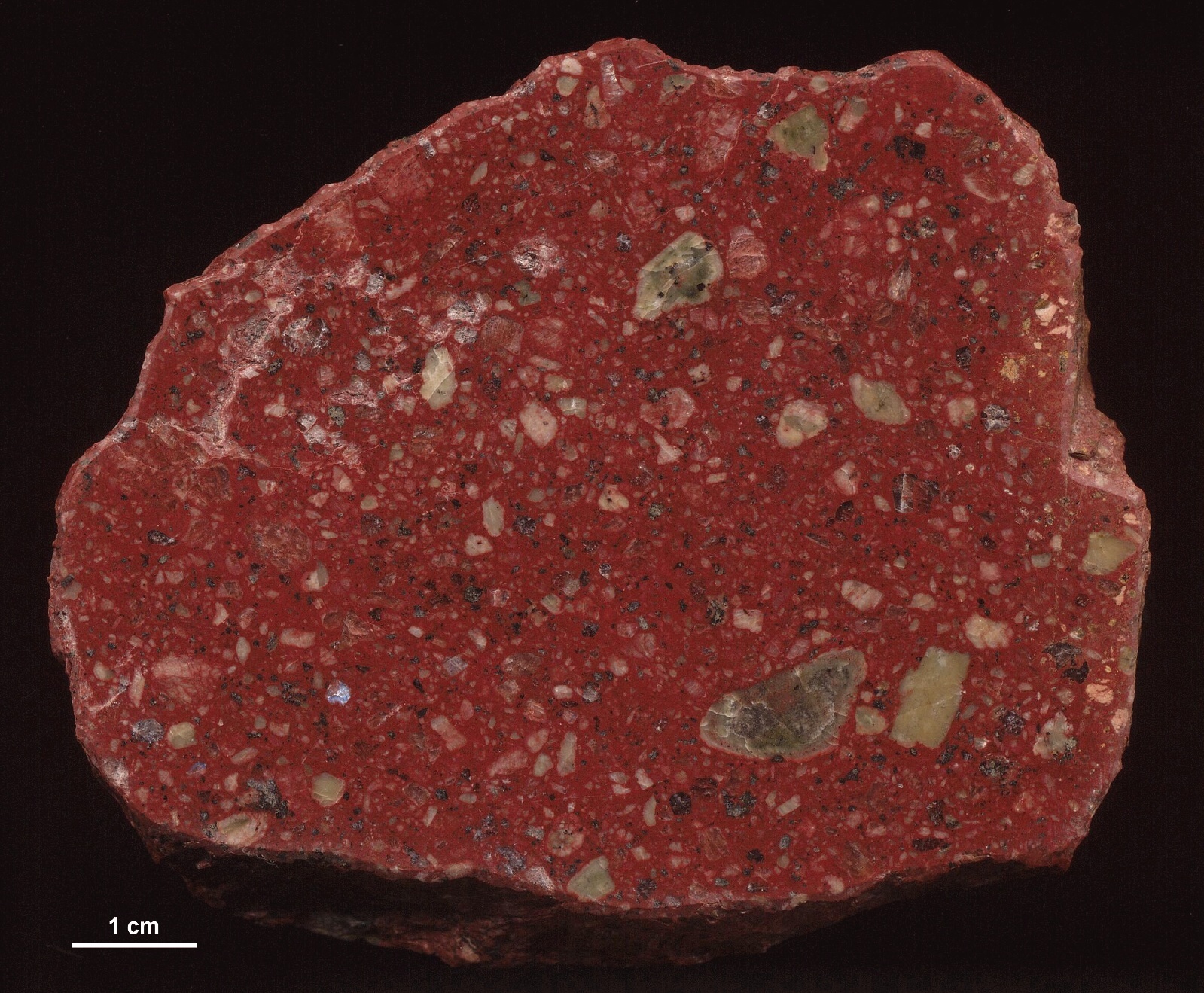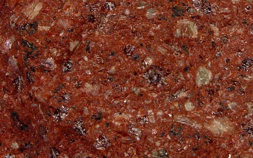 Das nächste Bild zeigt das gleiche Gestein als polierten Schnitt. Die Quarze sind nicht ganz so deutlich zu erkennen, dafür die Feldspäte um so besser. | ||||||||||||||||||||||||||||||||||||||||||||||||||||||||||||||||||||||||||||||||