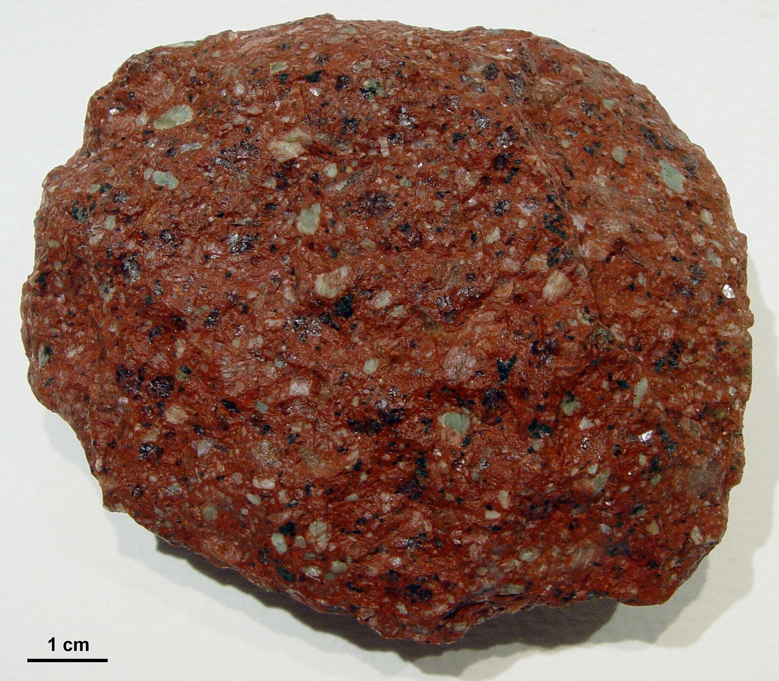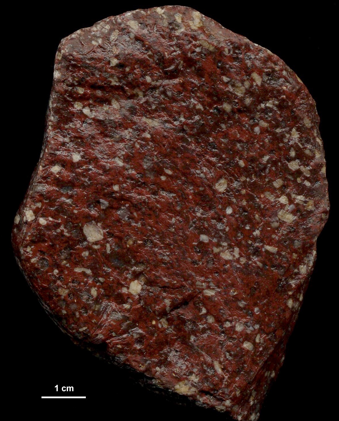 Einige wenige Porphyre aus Dalarna führen Quarz in nennenswerter Menge. Für die Geschiebekunde ist das natürlich sehr willkommen, ist Quarz doch ein "von Hand" leicht zu bestimmendes Mineral. Der Särna-Quarzporphyr tritt in einer roten und einer violetten Form auf. Die violette enthält tendenziell mehr Einsprenglinge und kann zusätzlich noch als Ignimbrit ausgebildet sein. Ignimbrite entstehen bei Vulkanausbrüchen. Sie sind das Ablagerungsprodukt heftiger, explosiver Ausbrüche. Die im Gefüge der Porphyre erkennbaren, leicht welligen Streifen sind flachgedrückte, ehemalige Bimssteinfladen. Zuerst jedoch der rote Särna-Quarzporphyr. Die Probe stammt aus dem Anstehenden im Norden Dalarnas (Kreuzung der Straßen 70 und 111) und wurde mir von Jan Kottner überlassen. | ||||||||||||||||||||||||||||||||||||||||||||||||||||||||||||||||||||||||||||||||