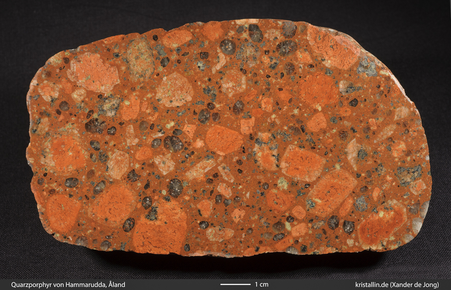 (4/32) Viele der Feldspäte enthalten kleine Einschlüsse. Oft ist das Quarz, aber es kommen auch Plagioklase oder kleine Flocken dunkler Minerale vor. Solche fleckigen Alkalifeldspäte mit vielen eingebauten Mineralen sind typisch für Rapakiwigranite. Dieser Porphyr hier ist nur einer aus einer ganzen Gruppe granitischer Gesteine, die allesamt zum Rapakiwimassiv von Åland gehören.