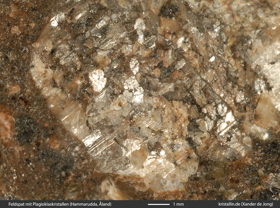 (11/32) So ein zusammengesetzter Kristall wie im vorigen Bild, jetzt aber auf einer Bruchfläche. Man kann sehr schön die Plagioklaszwillinge als dünne, eng parallele Linien erkennen. Nur wenn man die gesehen hat, hat man Plagioklas bestimmt.