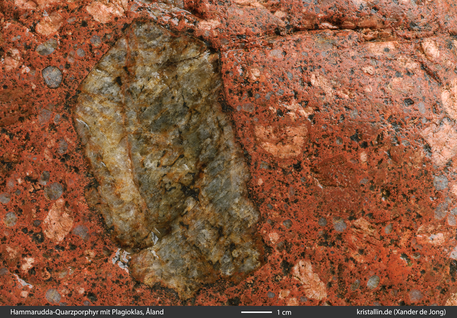 (22/32) Das ist mal ein großer Plagioklaseinschluss. Im oberen Teil erkennt man noch die Kanten des ehemaligen Kristalls, der vermutlich aus einem Anorthosit stammt. Solche fremden Kristalle („Xenokriste“) sind in diesen Gesteinen hier fast immer leicht grünlich. Nur selten sieht man richtig graue Plagioklase.