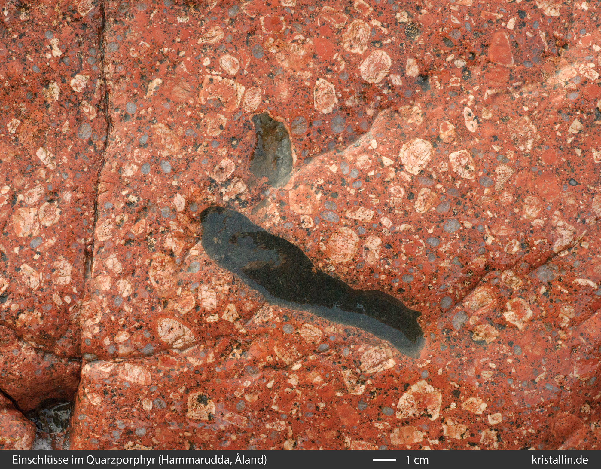 Die schwarzen Flecken sind Reste einer zweiten (mafischen) Gesteinsschmelze, die zusammen mit dem Porphyr aufstieg. Diese zweite Schmelze hatte in etwa die Zusammensetzung eines Gabbros bzw. Basalts und gehört nicht in den granitischen Porphyr. Daher Xenolith, also „fremdes Gestein“.