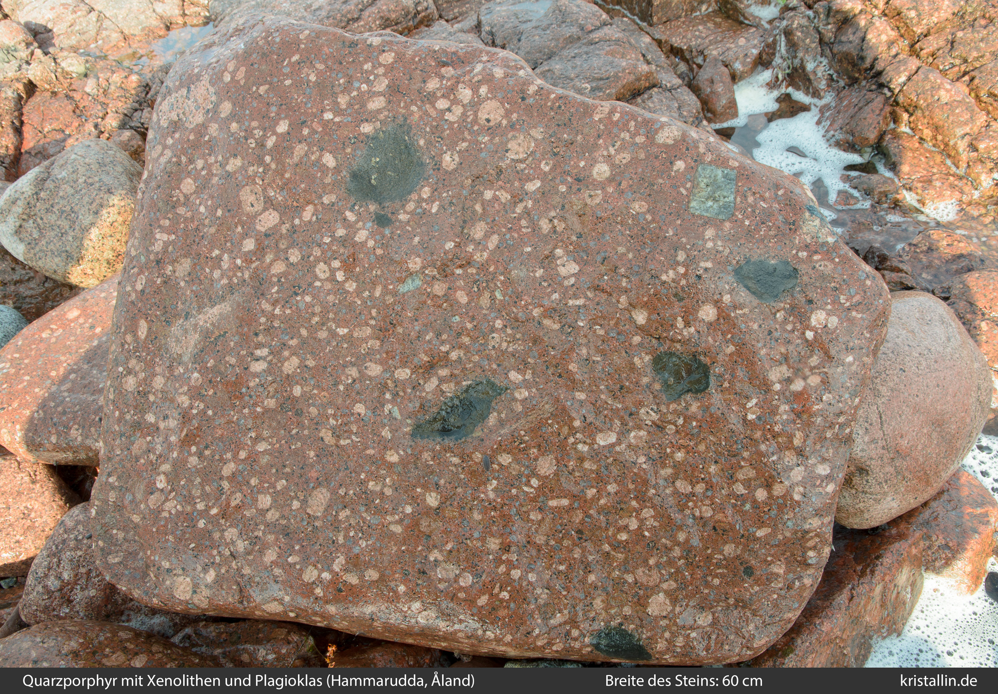 Most xenoliths are only a few centimetres in size. However, they occur in such large quantities and so regularly that they can also be found in smaller stones. The wet pebbles on the beach of Hammarudda show this particularly well (pictures 24 and 25). Note also the dark quartz porphyry in picture 25, which is the dark variant of Hammarudda described above, surrounded by several red quartz porphyries. At 11 o'clock a pale Åland Rapakivi, which is here as a local erratic between the porphyries.