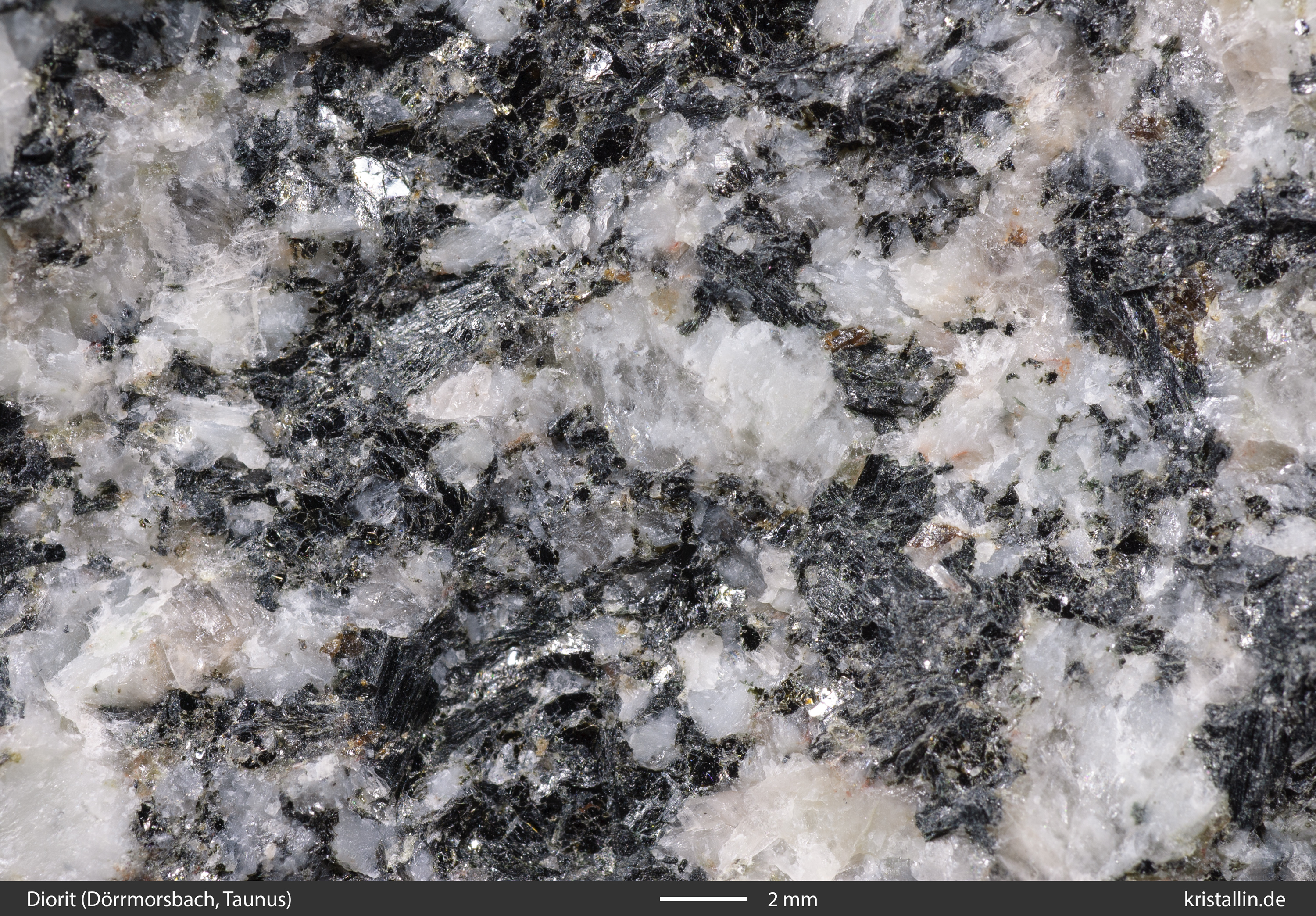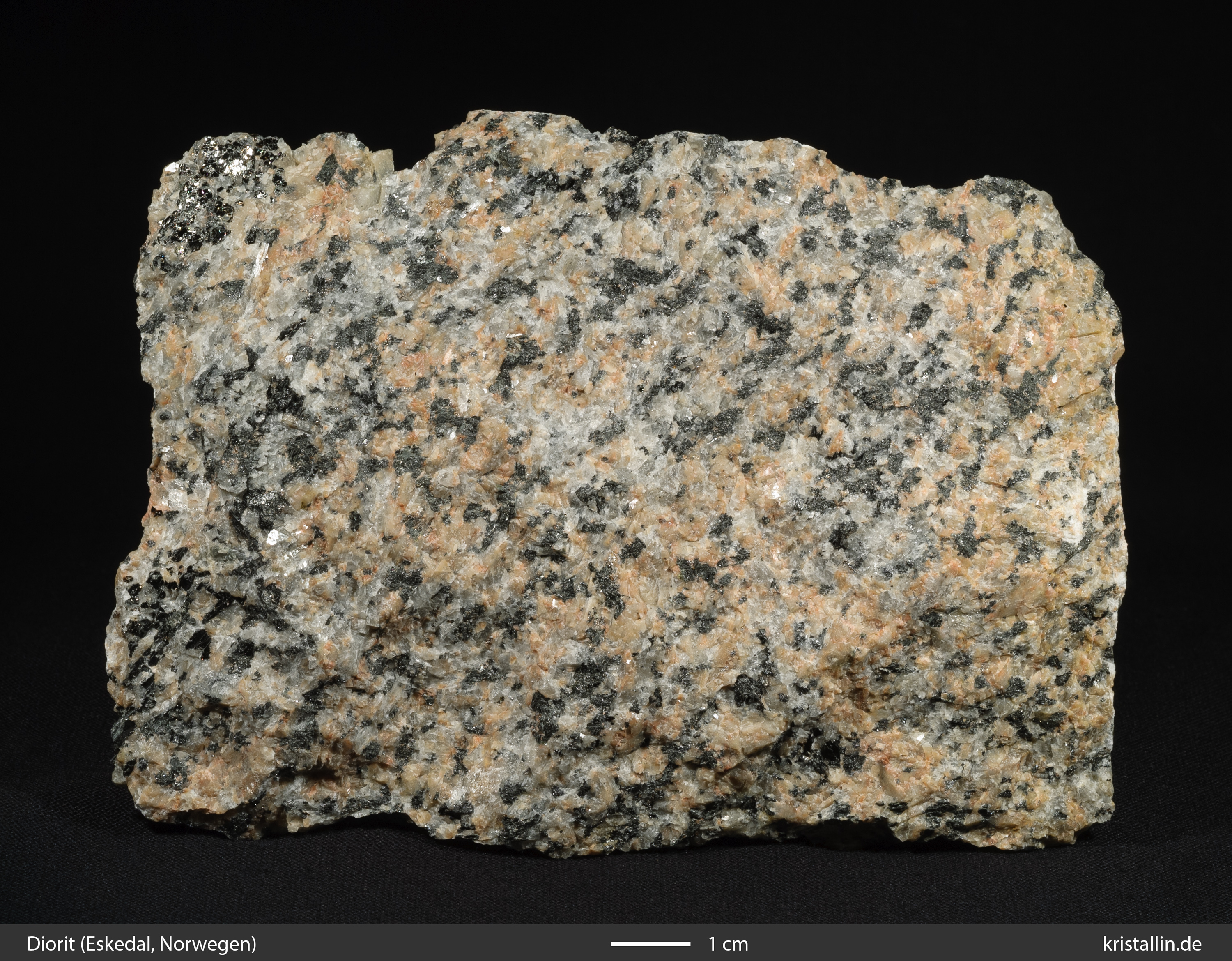 Leicht farbige Diorite sind eine Ausnahme. Das zeigt das folgende Handstück aus Südnorwegen, bei dem die vielen Plagioklase schon im Gelände den Verdacht weckten, dass dies ein Diorit sein könnte. Aber erst ein Dünnschliff brachte die Bestätigung.