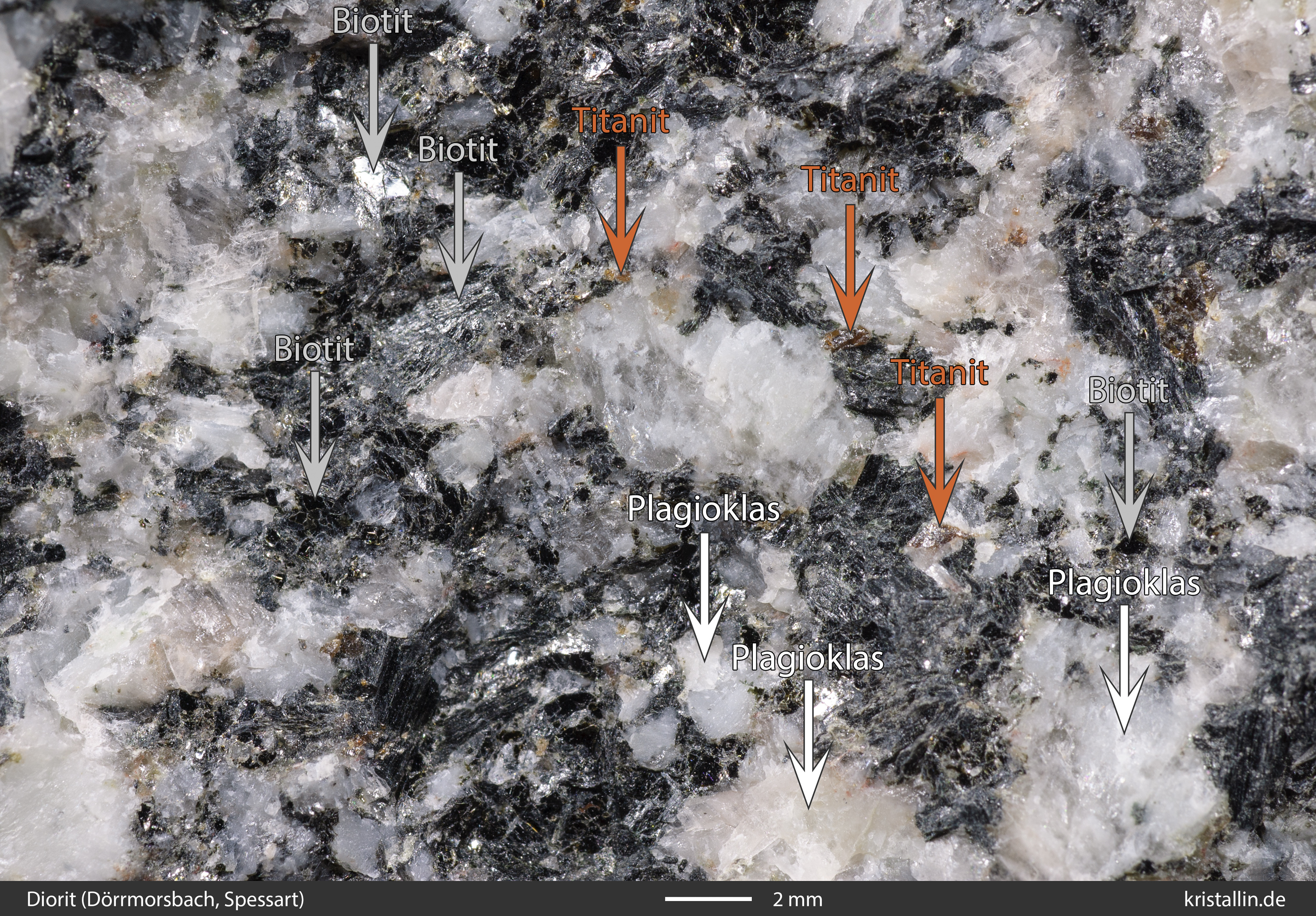 Diorit ist ein grobkörniges, magmatisches Tiefengestein mit Plagioklas als einzigem Feldspat. Typische Diorite sehen schwarz-weiß aus und enthalten neben Plagioklas noch Biotit oder Hornblende oder beide. Titanit kann in kleiner Menge vorkommen, Quarz fehlt in der Regel.