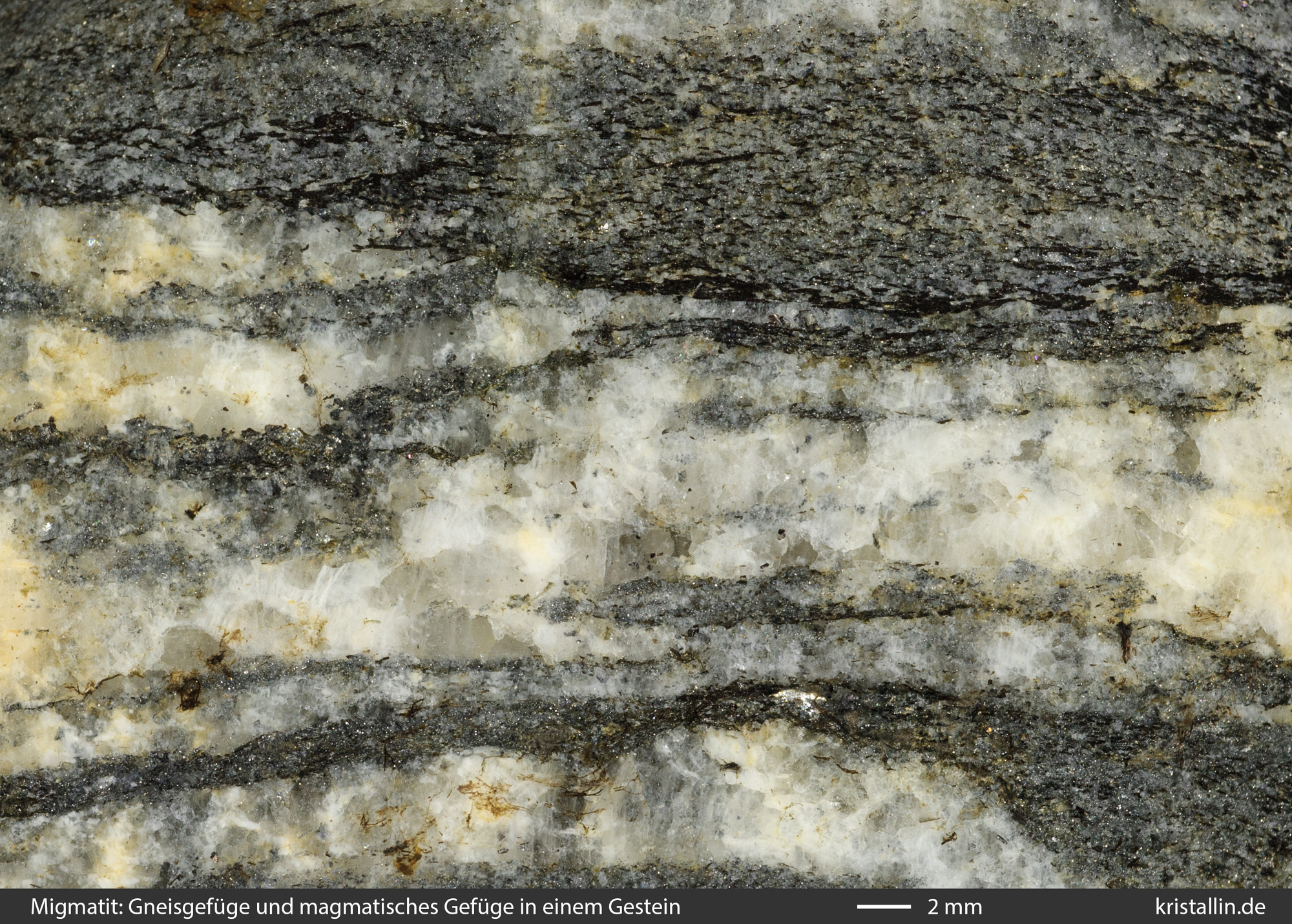 Die Taschen oder Streifen mit der Schmelzbildung kann man mit bloßem Auge erkennen. Sie bestehen immer aus hellen Mineralen, die undeformiert und richtungslos körnig sind. Der blaue Pfeil im Bild 18 zeigt auf einen Streifen mit magmatischem Gefüge, der ringsum vom gestreiften Gneisgefüge (weißer Pfeil) umgeben ist. Migmatite bilden den Übergang zu magmatischen Gesteinen und schließen einen der Kreisläufe in der Geologie.