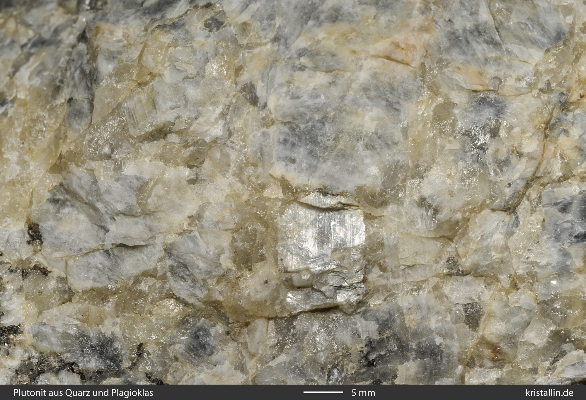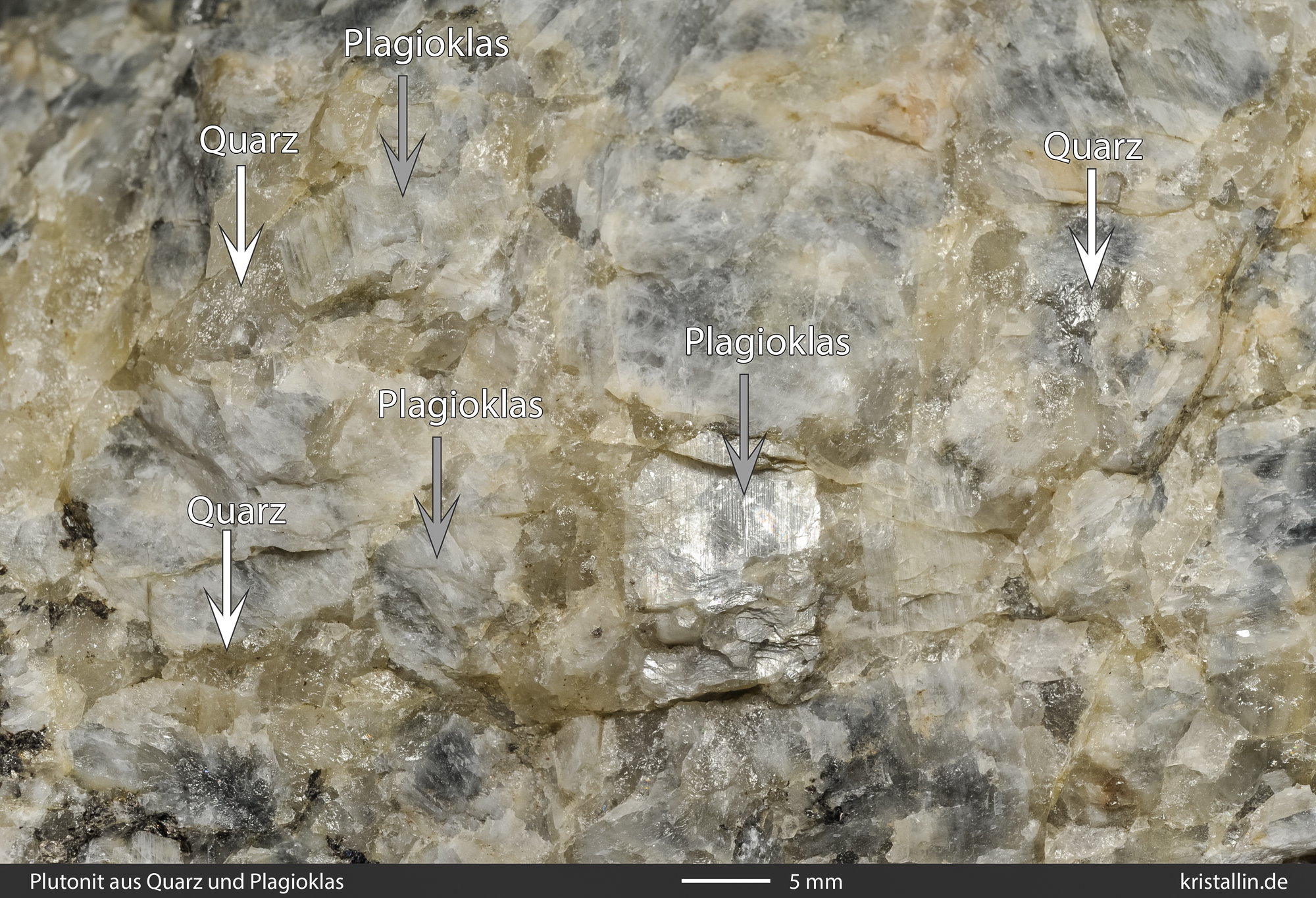 Der leicht gelbliche Quarz macht etwa ein Drittel des Gesteins aus. Der Plagioklas ist schwach blaugrau bis weißlich-fleckig. Der spiegelnde Kristall in der Mitte zeigt die für Plagioklas typische Zwillingsstreifung. Sie sind das entscheidende Bestimmungsmerkmal für Plagioklas und nur mit Lupe erkennbar. Diese Zwillinge muss man gesehen haben, um von Plagioklas zu reden und sie sind einer der Gründe, weshalb Geologen immer als Erstes zur Lupe greifen.