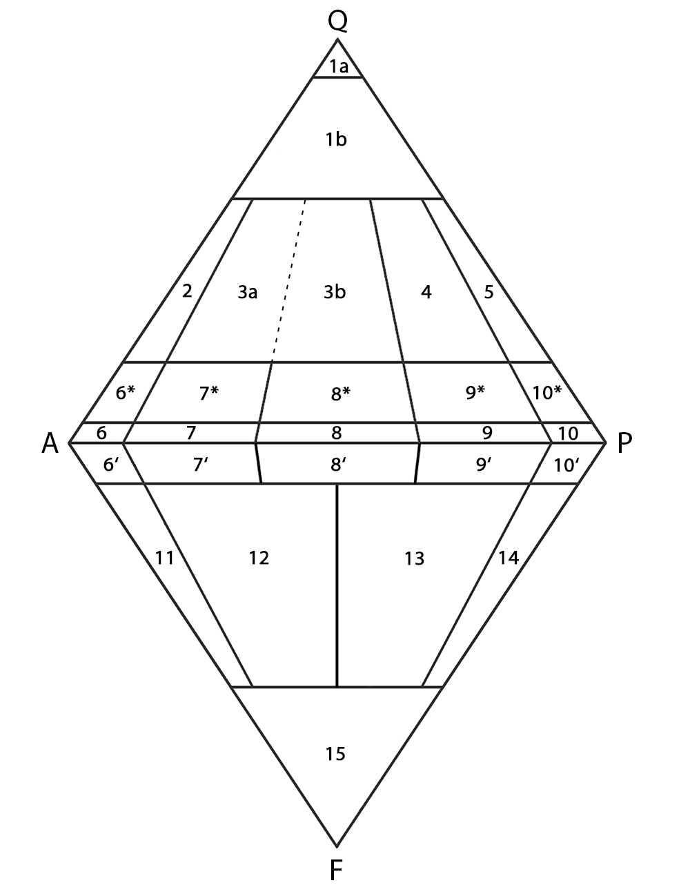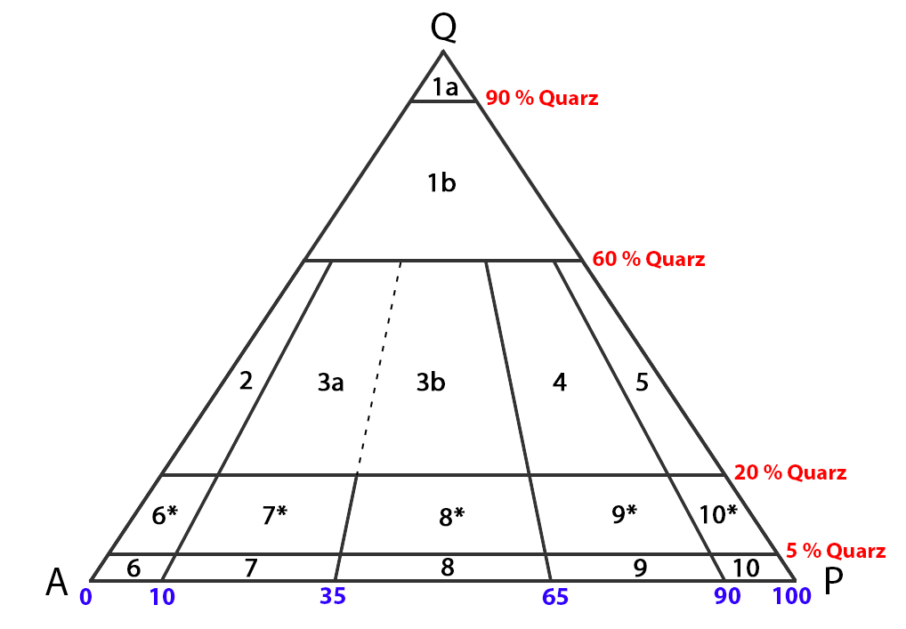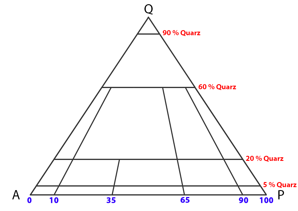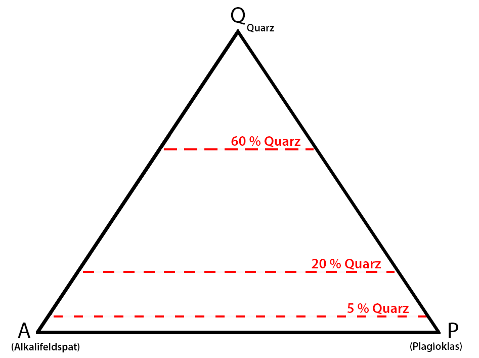 Um Minerale in einem Gestein darzustellen, benutzen Geologen Dreiecke, in denen für jedes Mineral eine Ecke reserviert wird. So steht in der folgenden Grafik ganz oben ein „Q“ für Quarz. Links unten beim „A“ gibt es nur Alkalifeldspat und ganz rechts, beim „P“, nur Plagioklas.