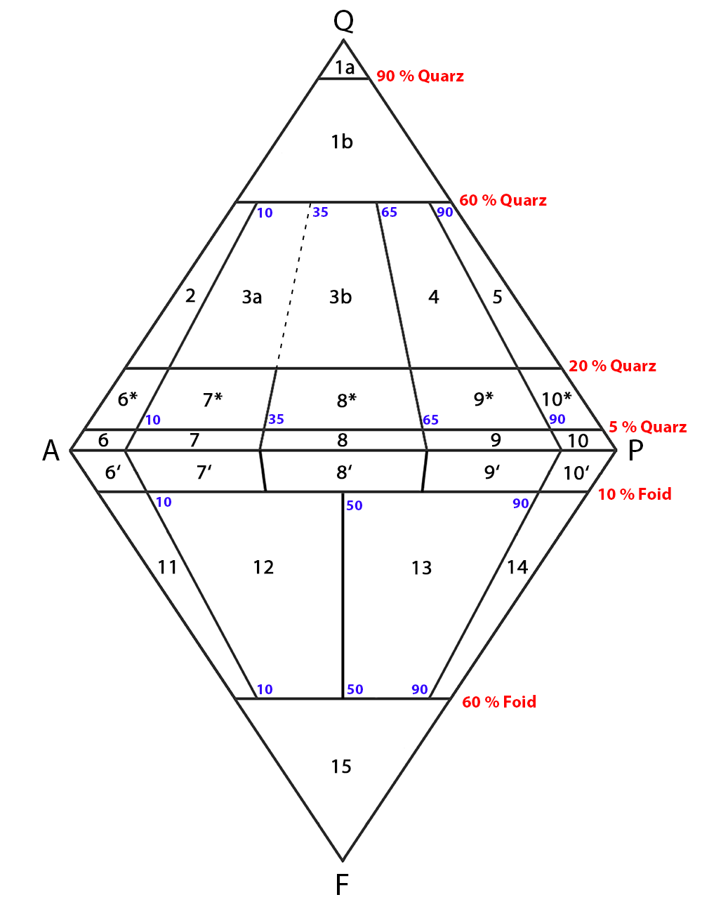 Die untere Hälfte betrifft Gesteine mit Feldspatvertretern (Foiden), die sehr selten sind. Da diese Minerale nie zusammen mit Quarz vorkommen(1), hat man das Dreieck nach unten gespiegelt und die Foide an die untere Spitze („F“) gestellt. Das zeigt die folgende Grafik.