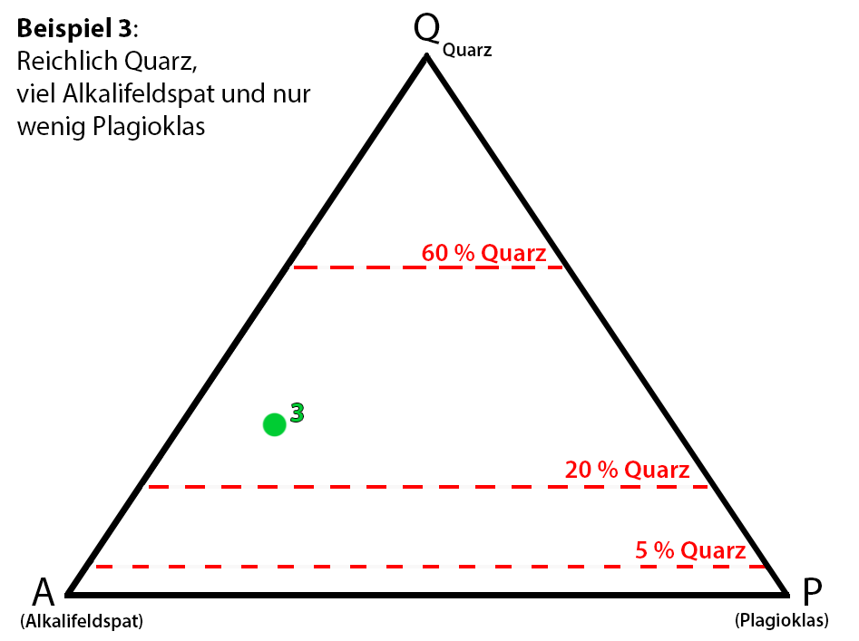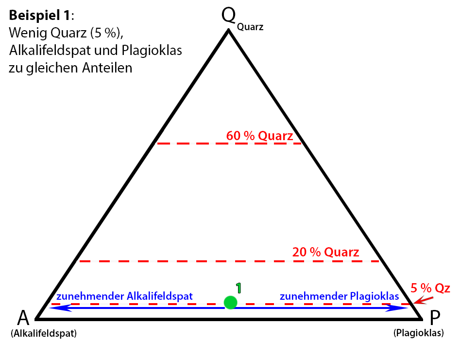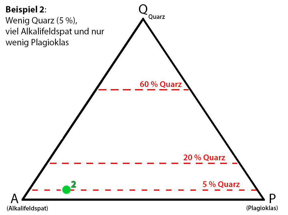 Ist dagegen mehr Alkalifeldspat als Plagioklas vorhanden (Beispiel 2), dann rutscht der sich ergebende Punkt in Richtung auf das A (für Alkalifeldspat). Es ergibt sich Punkt 2 - bei gleichem Quarzgehalt.