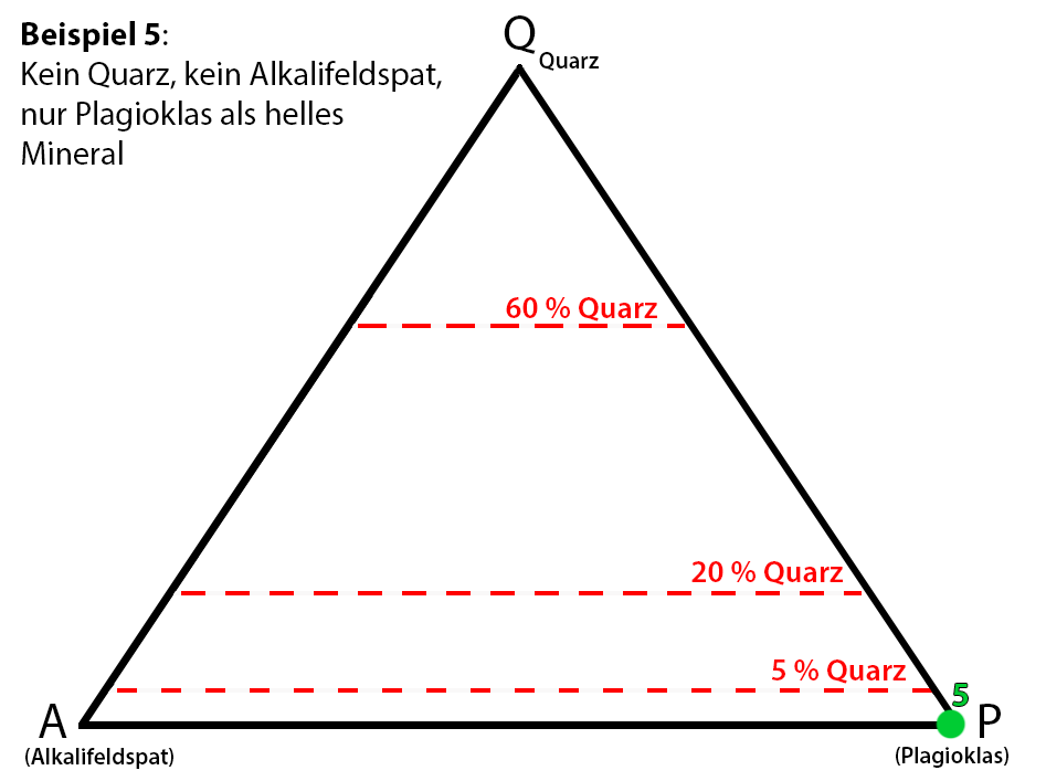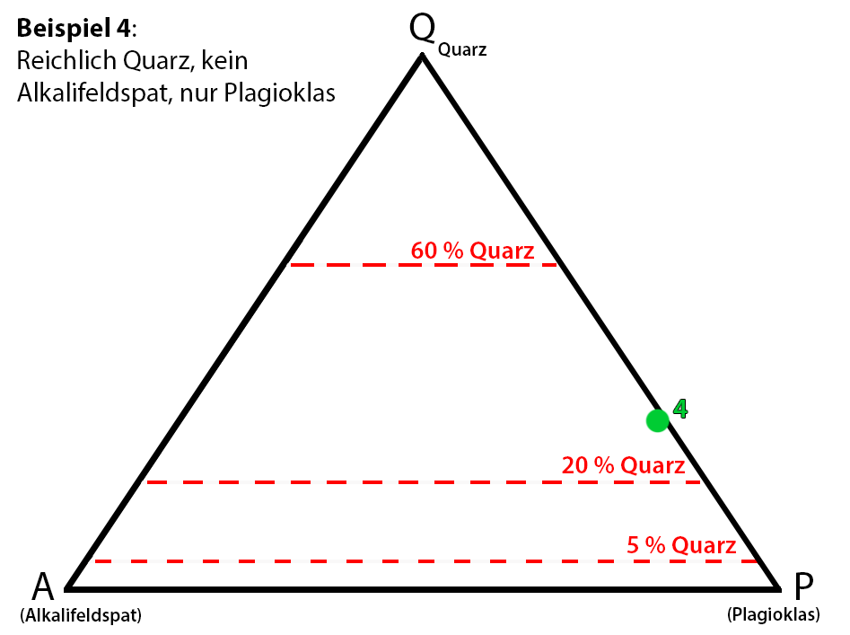 Im Beispiel 4 gibt es bei gleichem Quarzgehalt nur einen Feldspat, nämlich Plagioklas. Damit rutscht der grüne Punkt ganz nach rechts zum Rand, wo der Plagioklasgehalt 100 % beträgt.