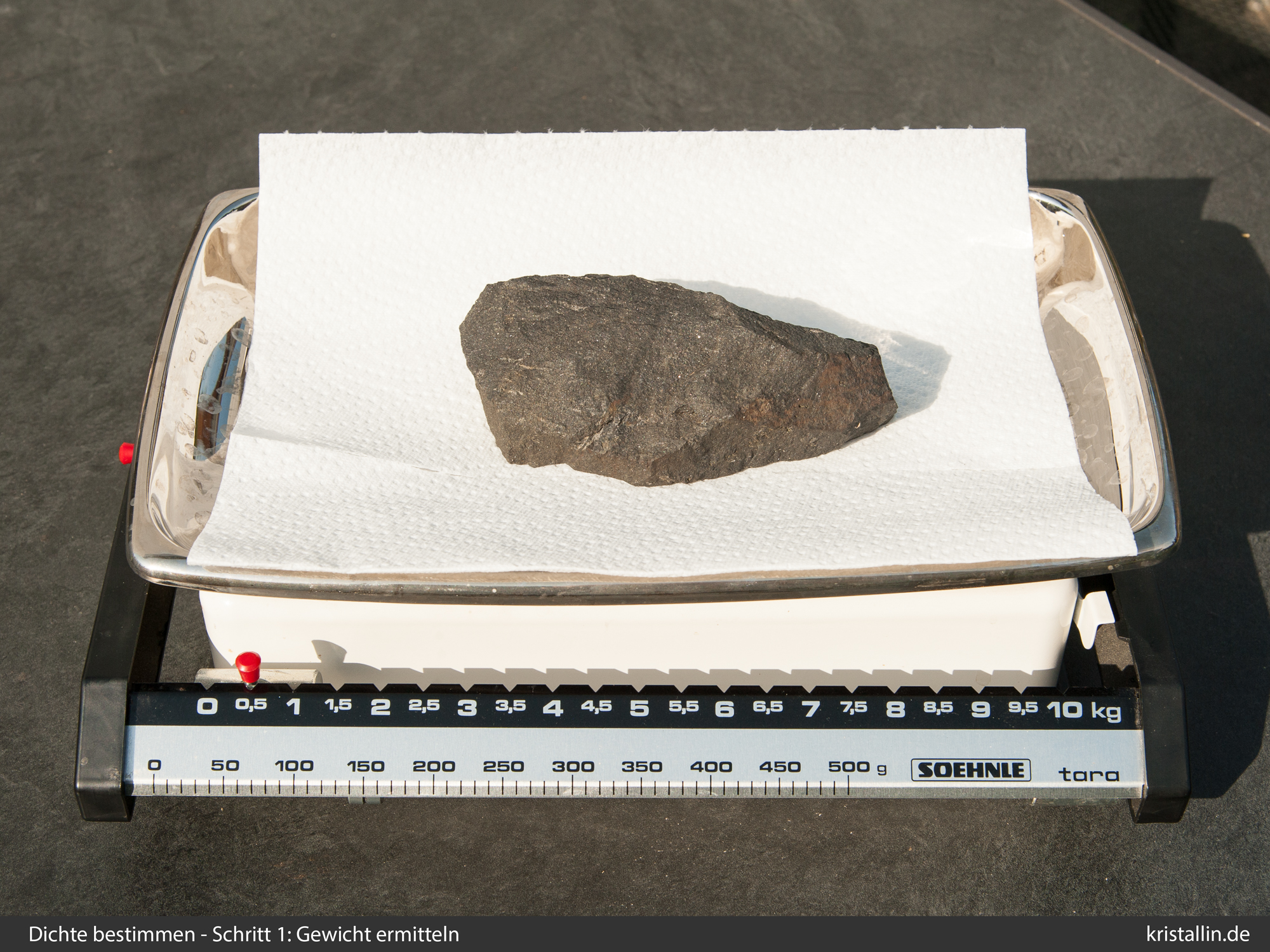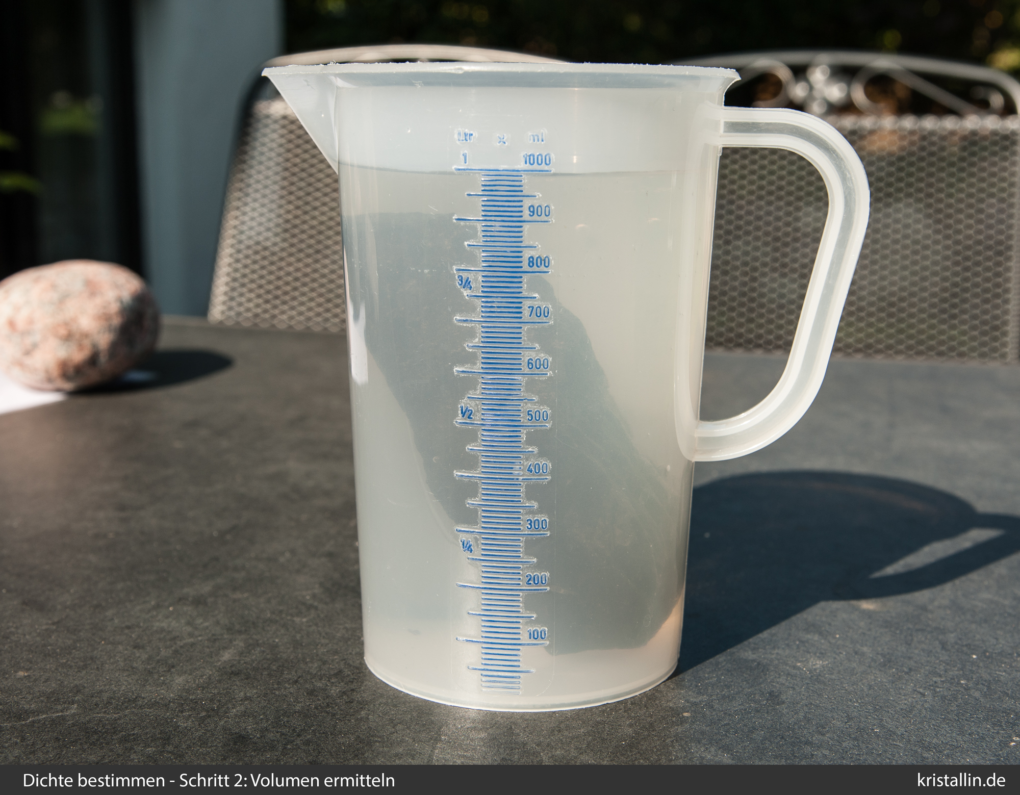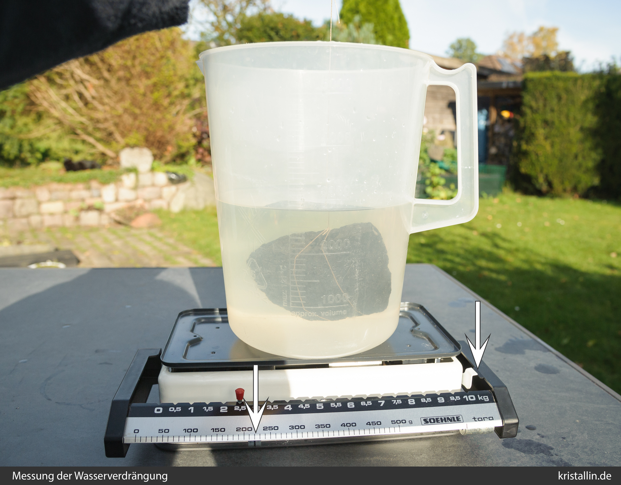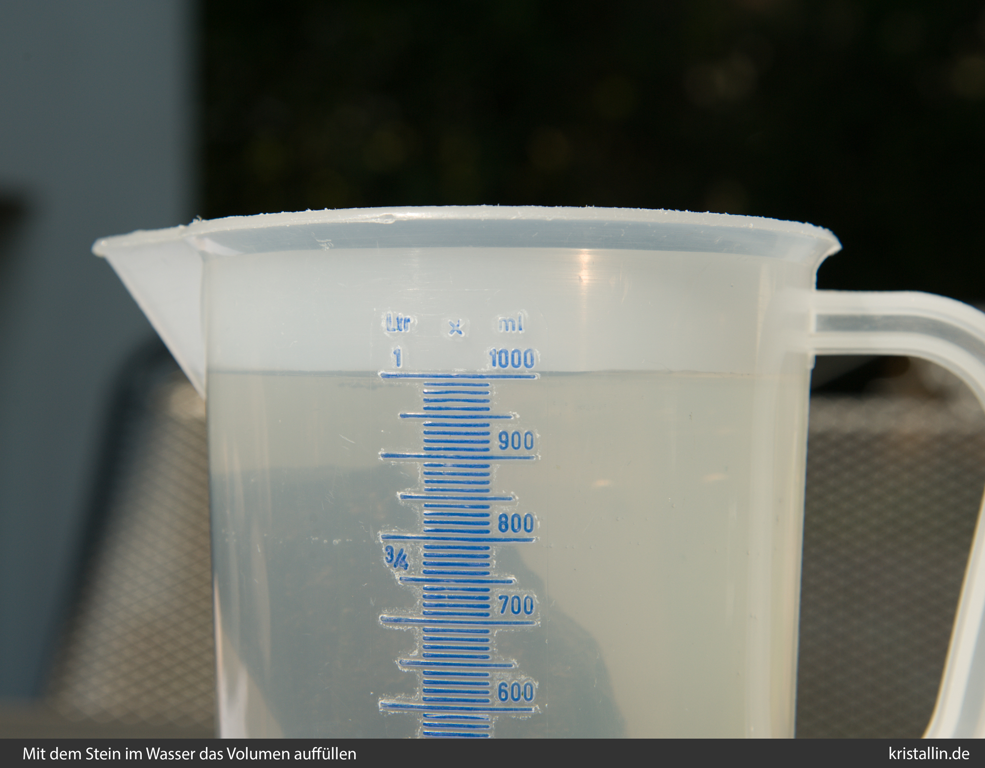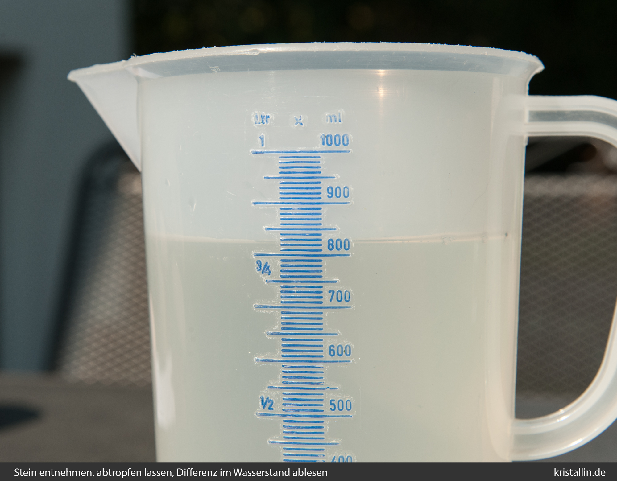 Ein besseres Verfahren ist die Messung des vom Stein verdrängten Wassers. Da Wasser eine Dichte von 1 hat, entspricht das Gewicht des verdrängten Wassers in Gramm genau dem Volumen des eingetauchten Steins in cm3.