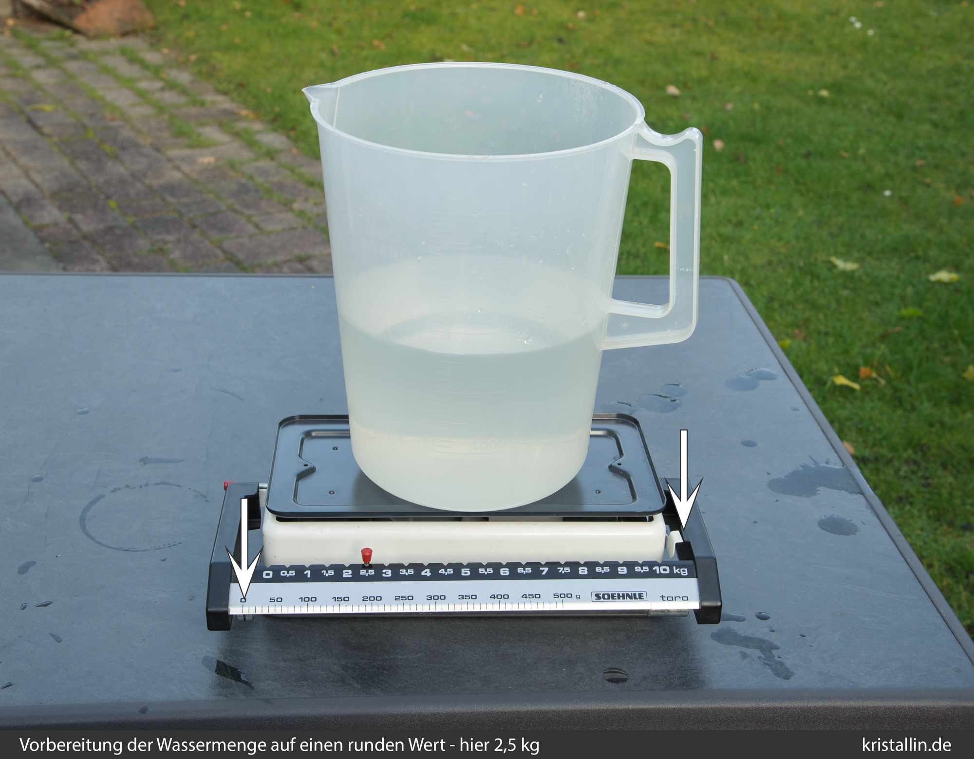 It makes sense to fill in so much water at the beginning that you get a round value. Here in the example it is 2.5 kilos. It is a bit tedious to measure this exactly, but you can easily read the subsequent weight gain.