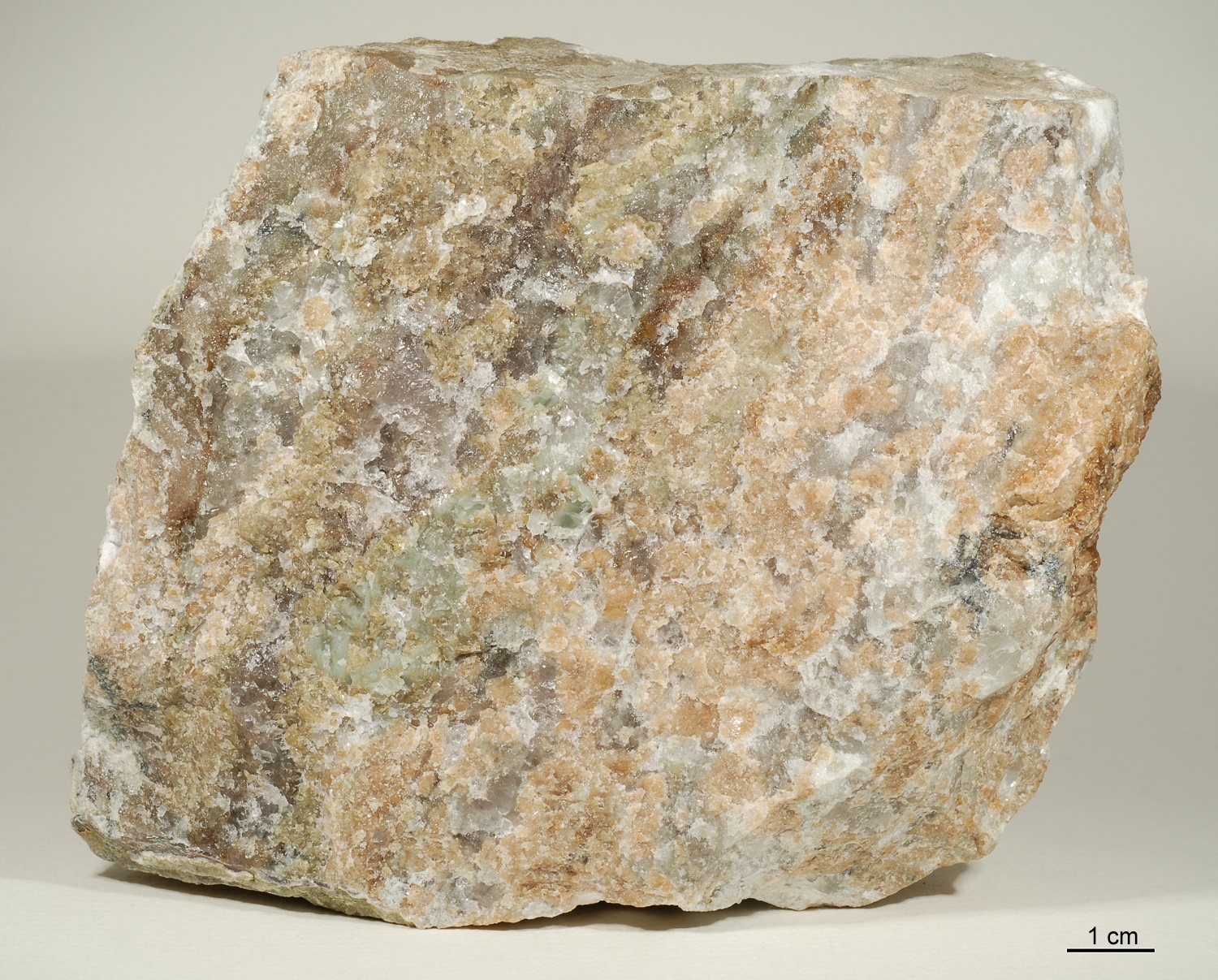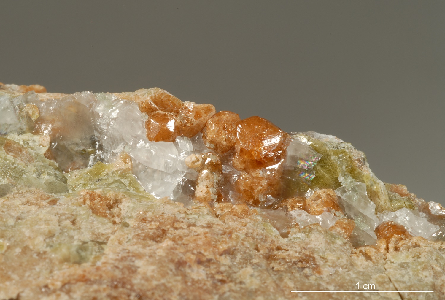 blaßgrünliche Mineral der Epidot, das hellbraune ist Granat und das hellgrau-weiße