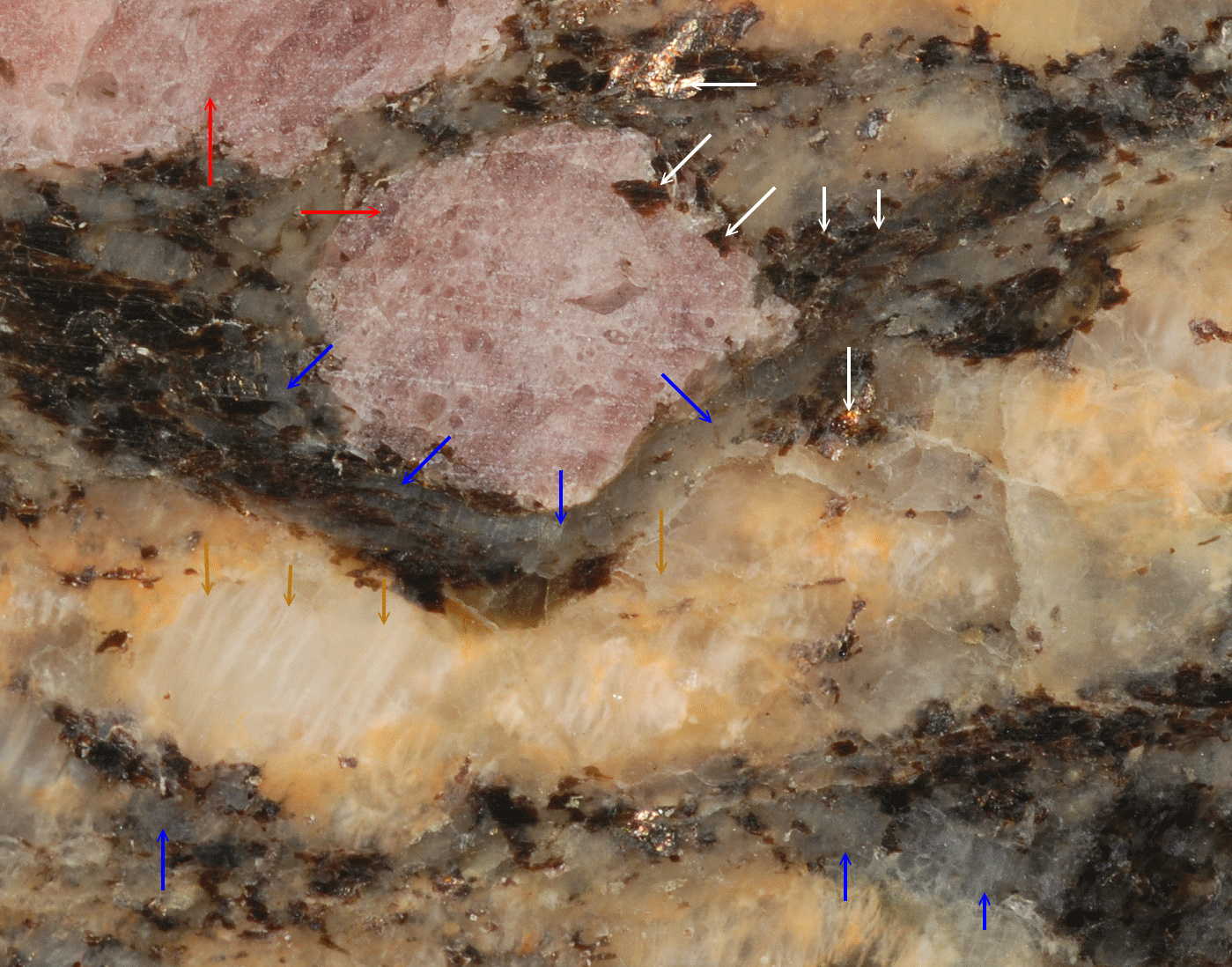 - Braune Pfeile: bräunlich-heller Alkalifeldspat. Die unscharfen, weißen