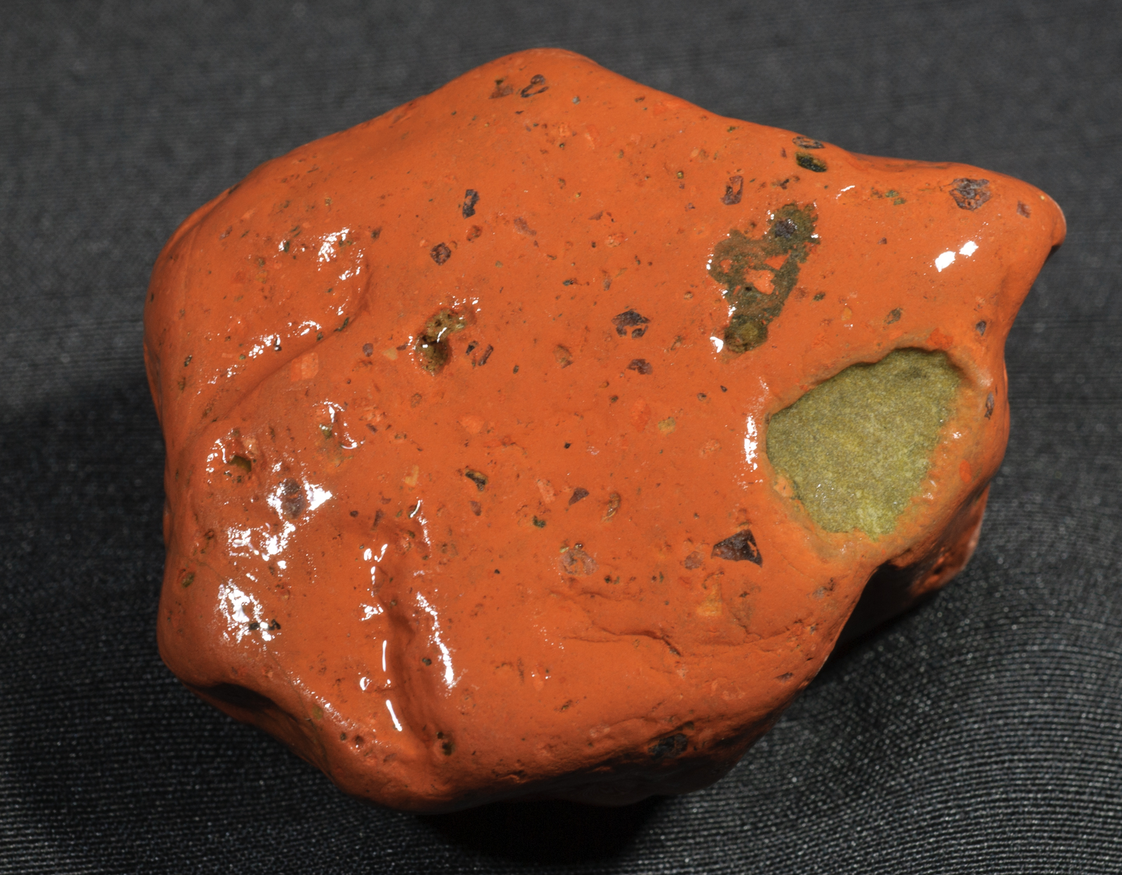 The red Baltic Sea quartz porphyry already stands out due to its intense, mostly brick-red colour. Without a magnifying glass, the stone appears homogeneous and details are hardly recognizable, except for the almost always contained dark and fine-grained xenolites. They belong to the characteristic features of this porphyry and are between a few millimetres and several centimetres in size. These irregularly shaped inclusions are interpreted as basaltic fragments carried along by the rising melt.