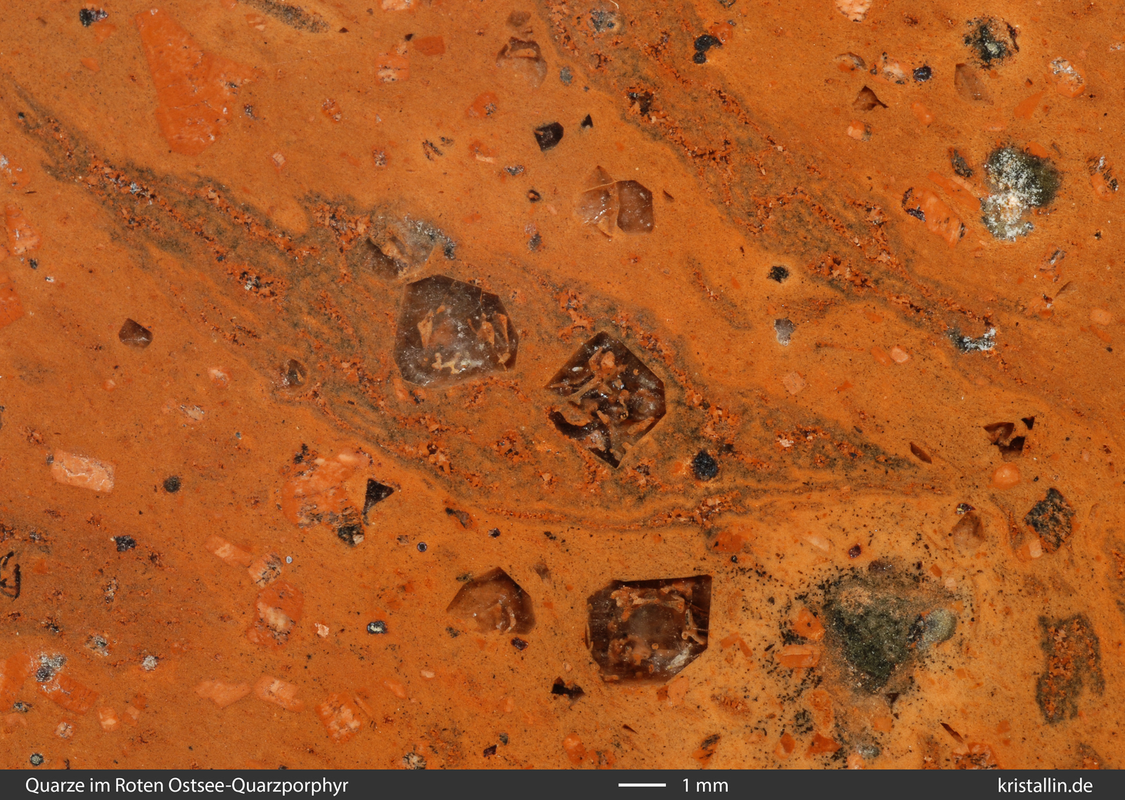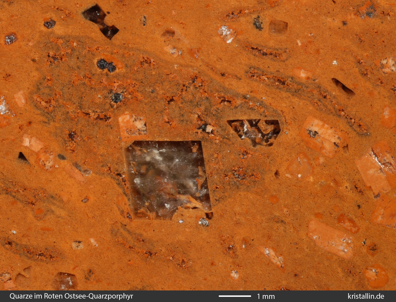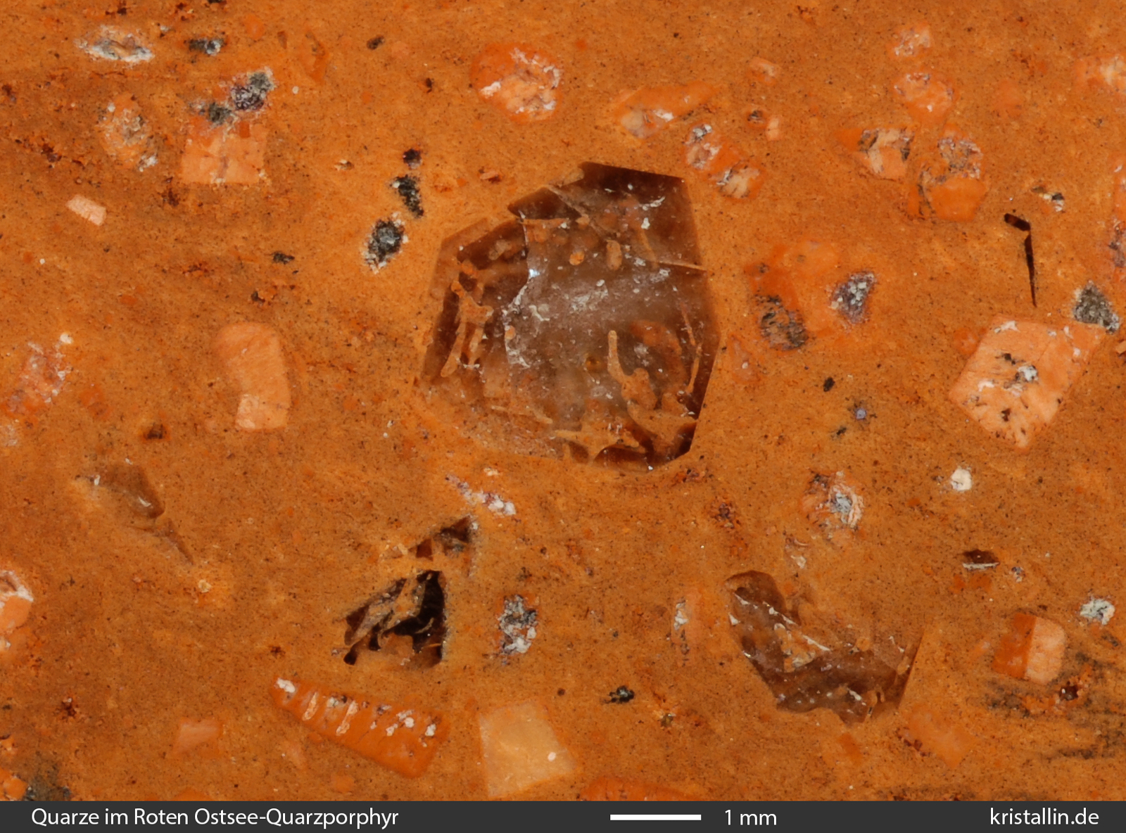 Einige der Quarze sind zerbrochen, viele zeigen kantige Umrisse und fast alle sind magmatisch korrodiert. Das erkennt man an den schlauchförmigen Einbuchtungen und Löchern, die mit roter Grundmasse gefüllt sind. Diese Löcher sind das Resultat der Anschmelzung bereits gebildeter Quarzkristalle. Solche „angefressenen“ Quarze gehören zu den Kennzeichen des Roten Ostsee-Quarzporphyrs.