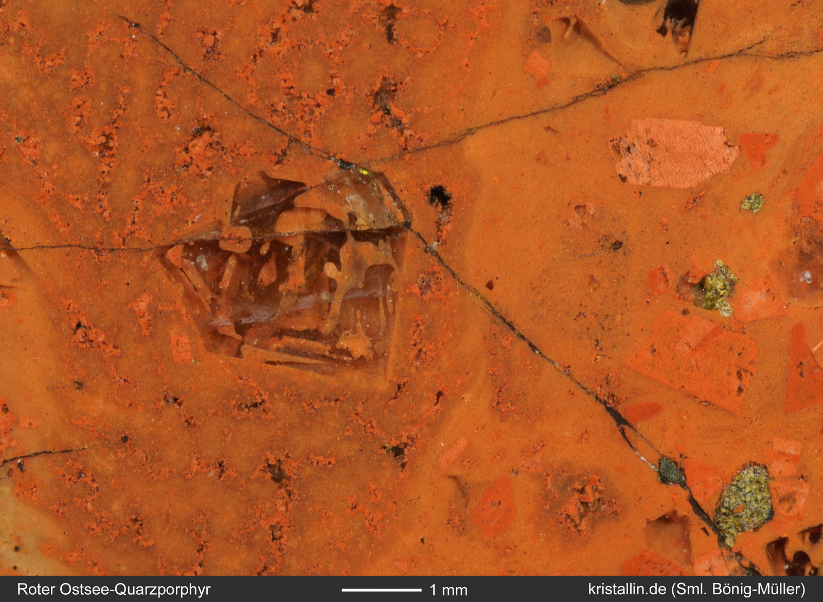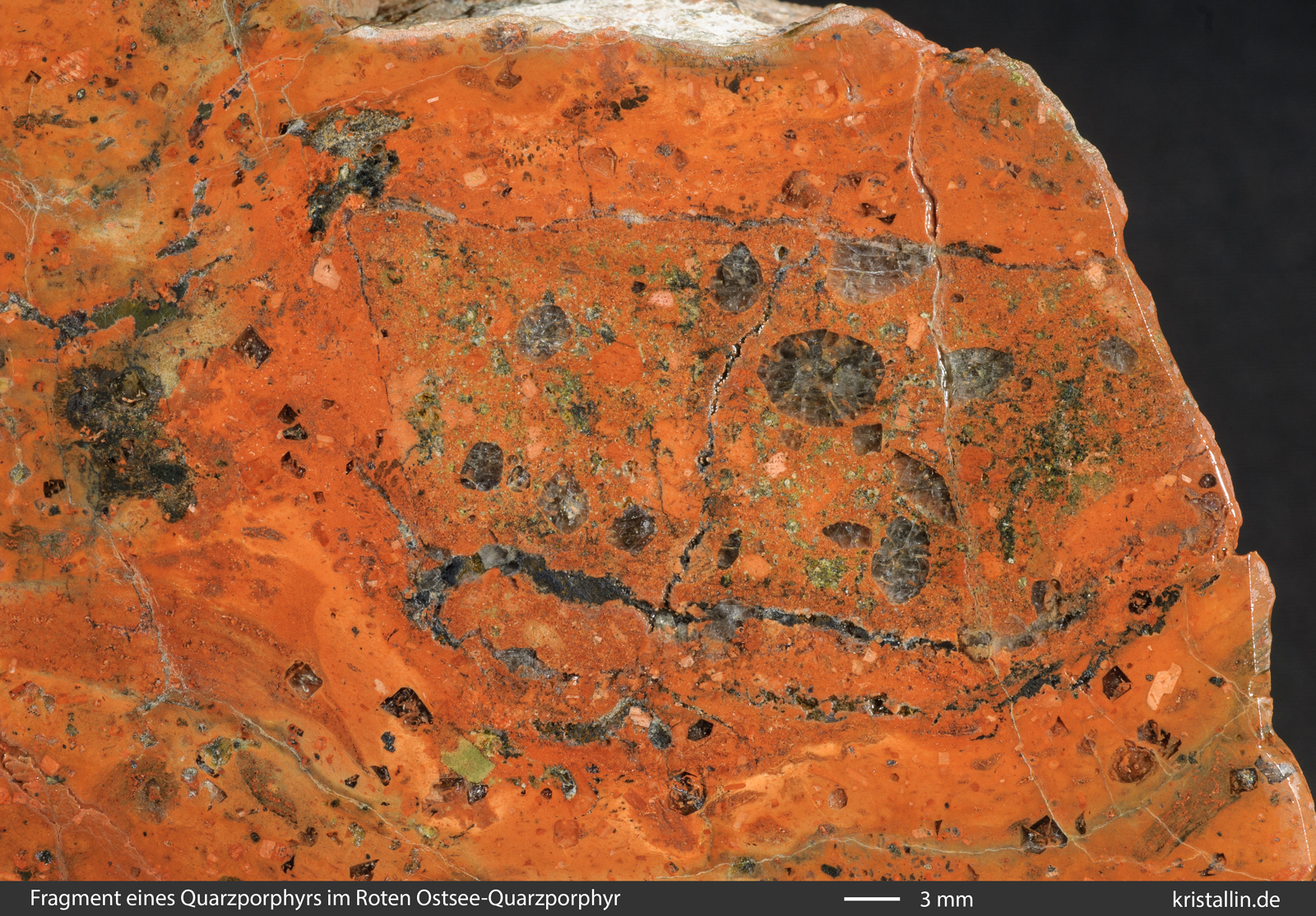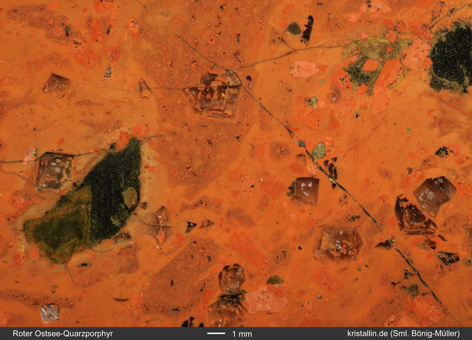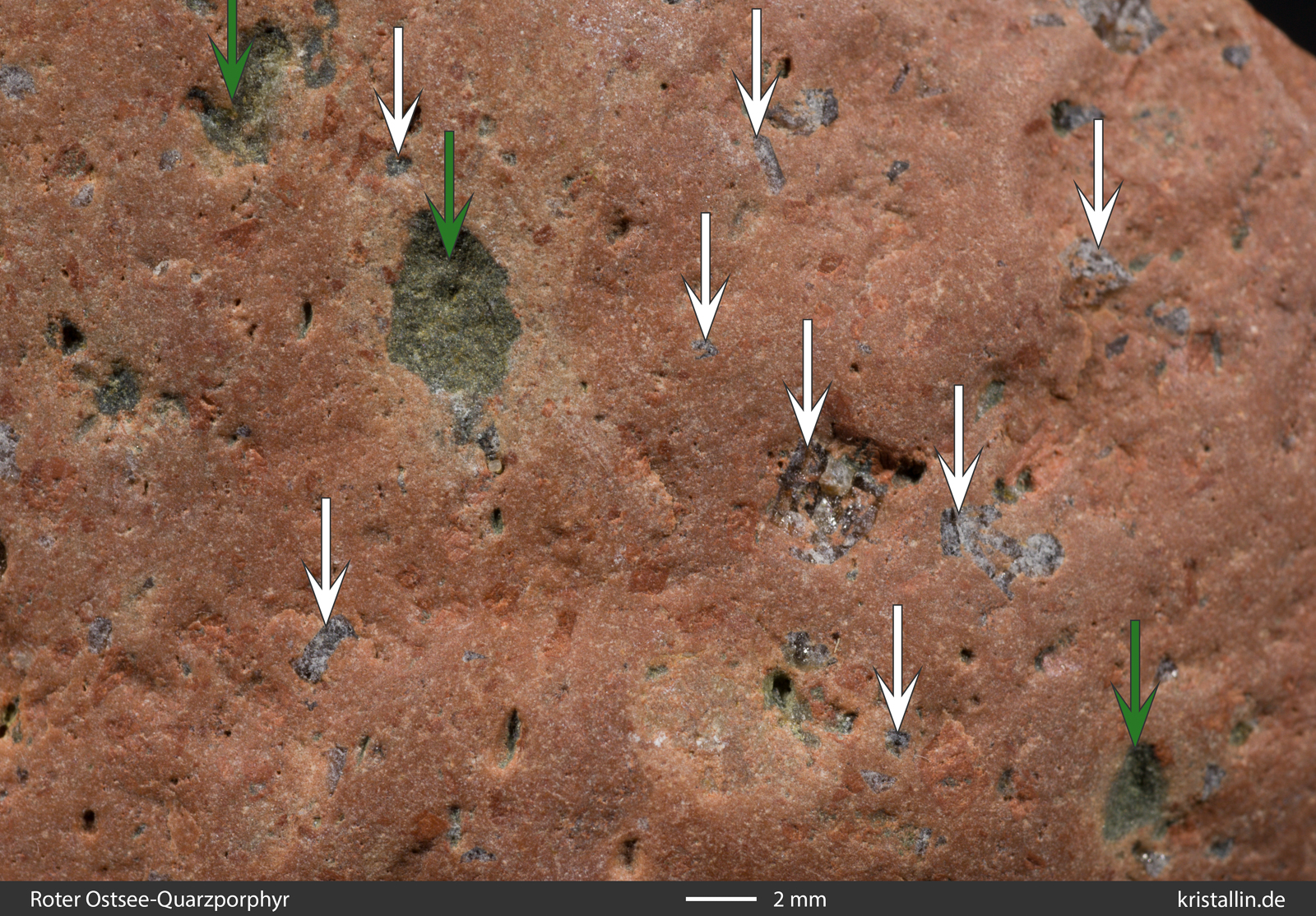Einige der Quarze sind zerbrochen, viele zeigen kantige Umrisse und fast alle sind magmatisch korrodiert. Das erkennt man an den schlauchförmigen Einbuchtungen und Löchern, die mit roter Grundmasse gefüllt sind. Diese Löcher sind das Resultat der Anschmelzung bereits gebildeter Quarzkristalle. Solche „angefressenen“ Quarze gehören zu den Kennzeichen des Roten Ostsee-Quarzporphyrs.