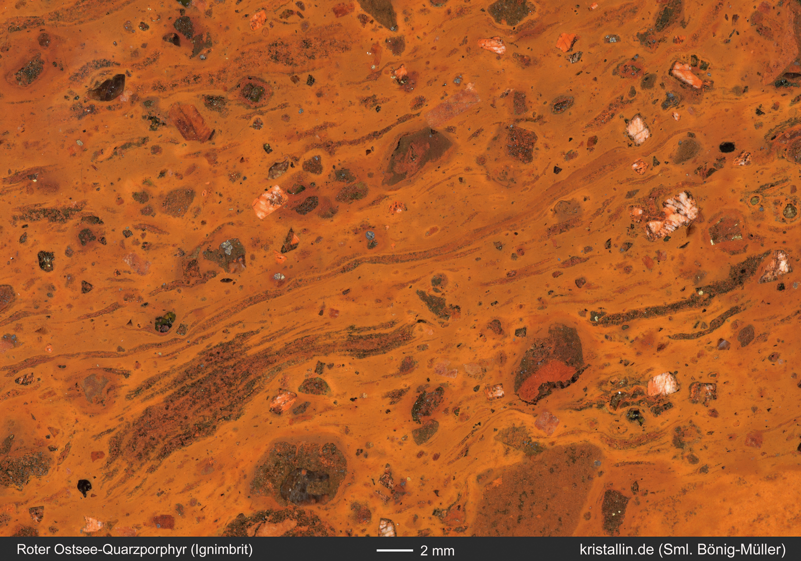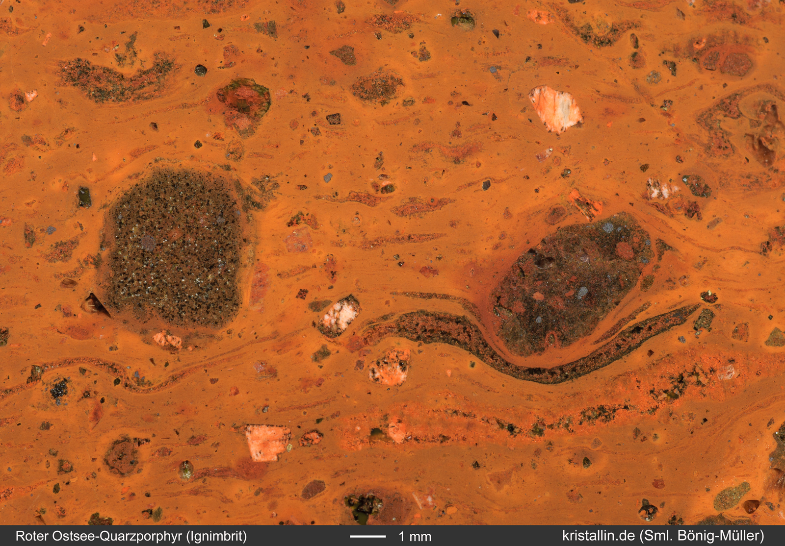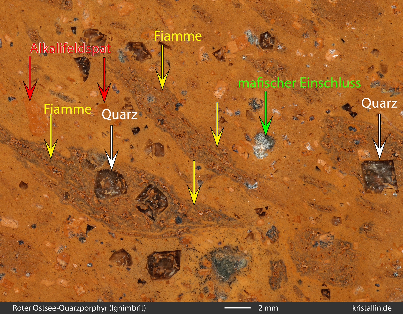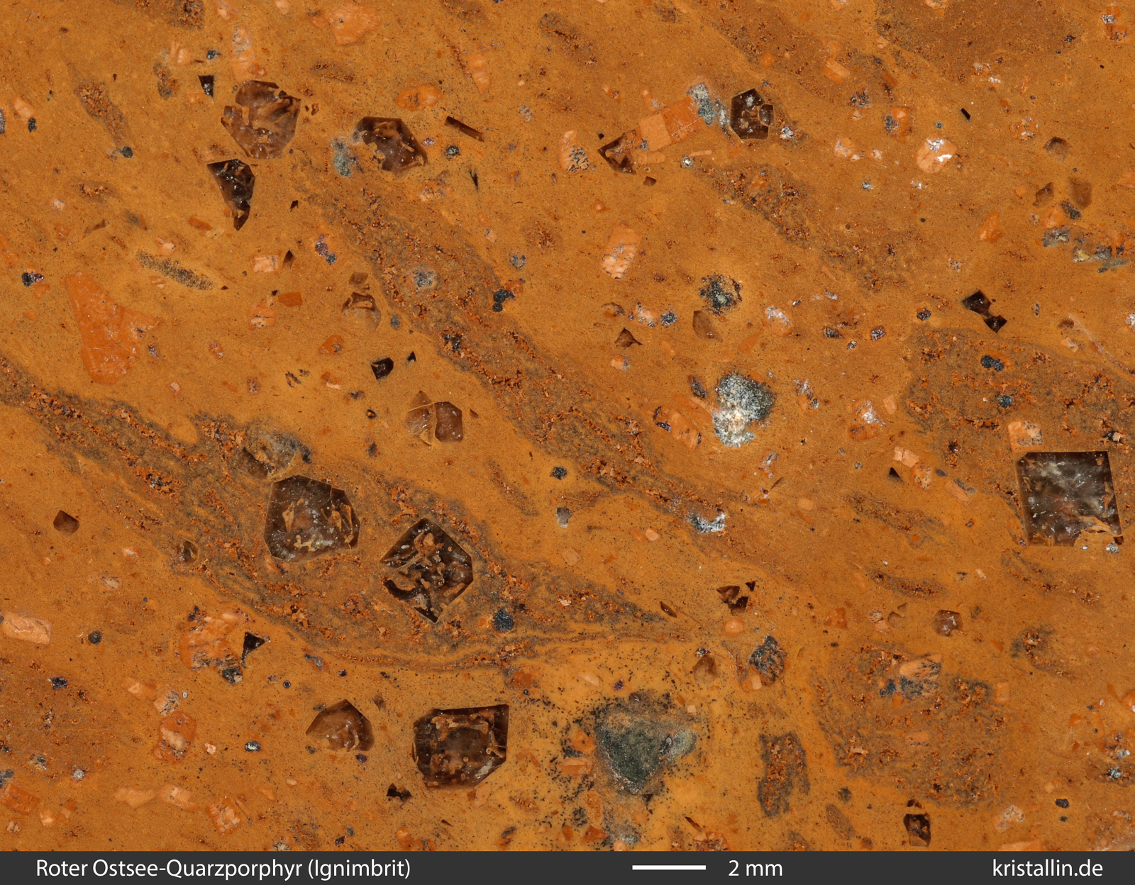 Zusammengefasst: Manche der Roten Ostsee-Quarzporphyre sind Ignimbrite mit hellbraunen Fiamme. Diese „Schlieren“ sind ehemals weiche Lavafetzen, die in pyroklastischen Strömen (bei Vulkanausbrüchen) abgelagert wurden. Die Fiamme sind immer kurz, unregelmäßig geformt bzw. gewellt und schmiegen sich um Kristalle oder Xenolithe herum. Nur wenn so ein Gefüge erkennbar ist, kann man von einem Ignimbrit reden. Schlieren in der Grundmasse allein genügen nicht.