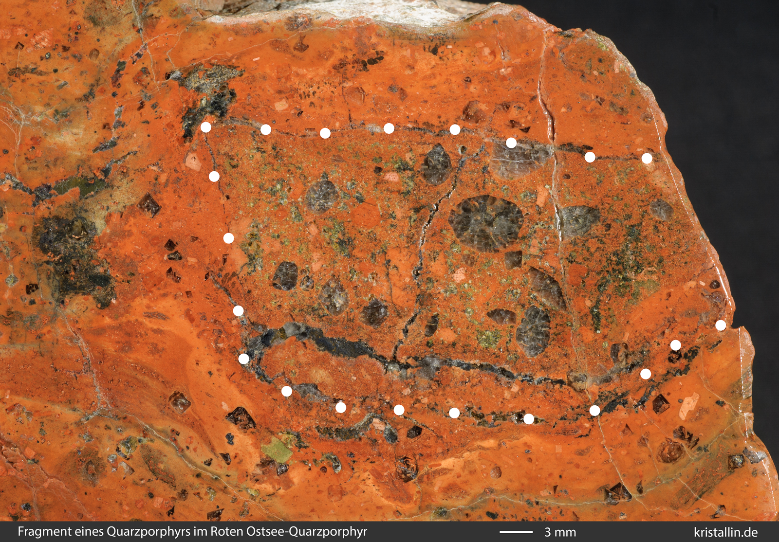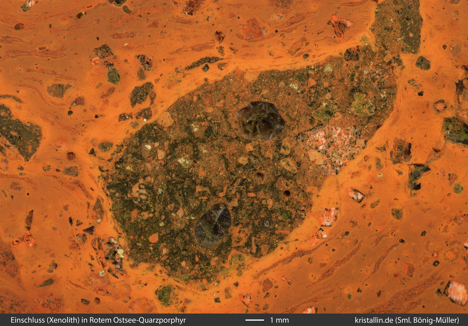 Der Xenolith selbst enthält wiederum einen Xenolith. Der ist etwas rosa und liegt rechts neben dem oberen runden Quarzkorn. Mit etwas gutem Willen kann man darin noch Reste perthitischer Entmischungen sehen. Die gibt es nur in den Alkalifeldspäten langsam abgekühlter Gesteine - also in Plutoniten. Damit gehört dieser (weiß umrandete) Einschluss nicht zum Xenolith und schon gar nicht zum einbettenden Roten Ostsee-Quarzporphyr. Er verweist auf eine viel weiter zurückliegende Geschichte dieses kleinen Einschlusses.