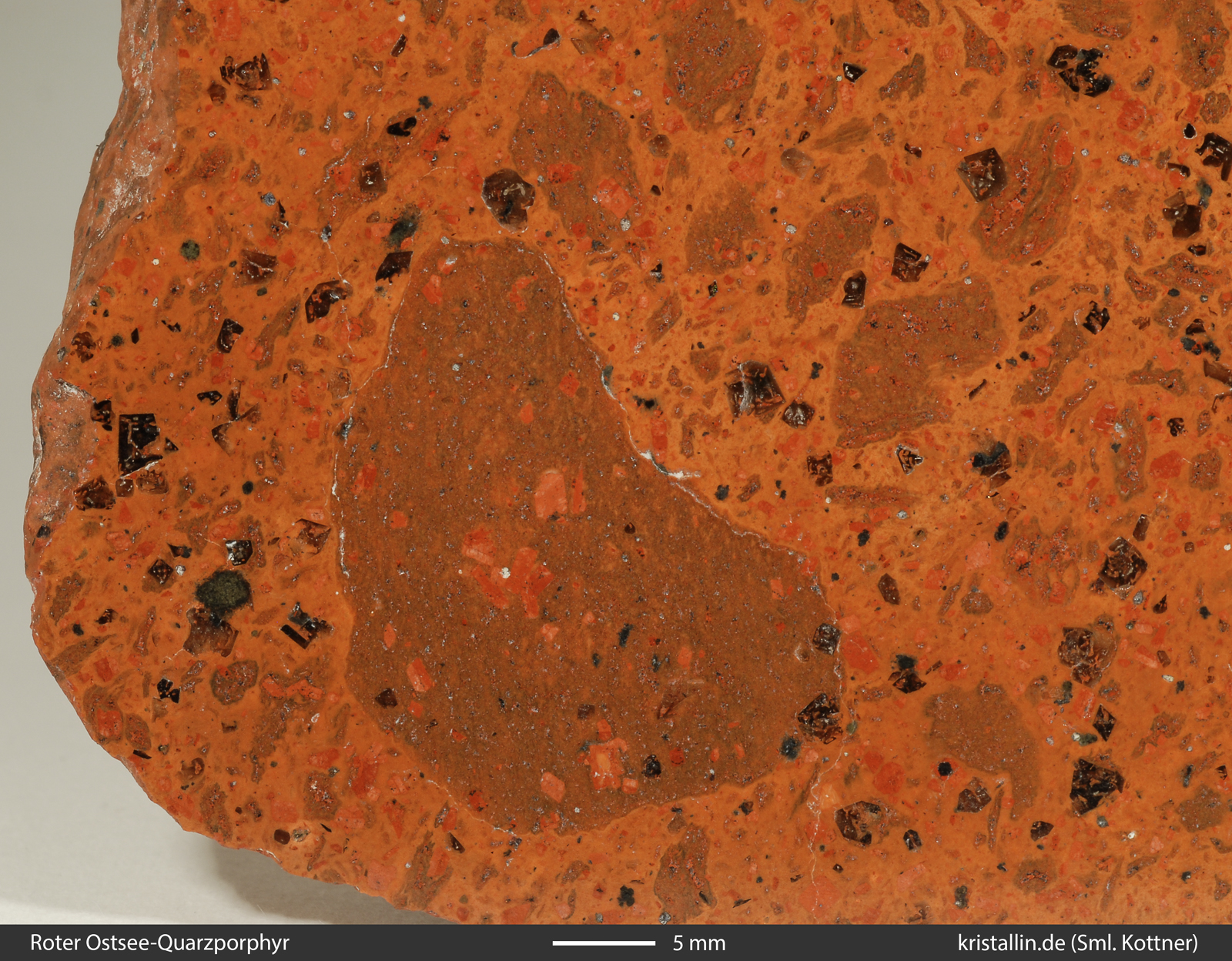 Zwei Dinge fallen hier auf: Die Quarze im Einschluss sind überwiegend rund und die kleinen grünen Flecken deuten auf fortgeschrittene Zersetzung von Mineralen hin. Vor allem wegen der runden Quarze ist der Einschluss selbst kein Roter Ostsee-Quarzporphyr.