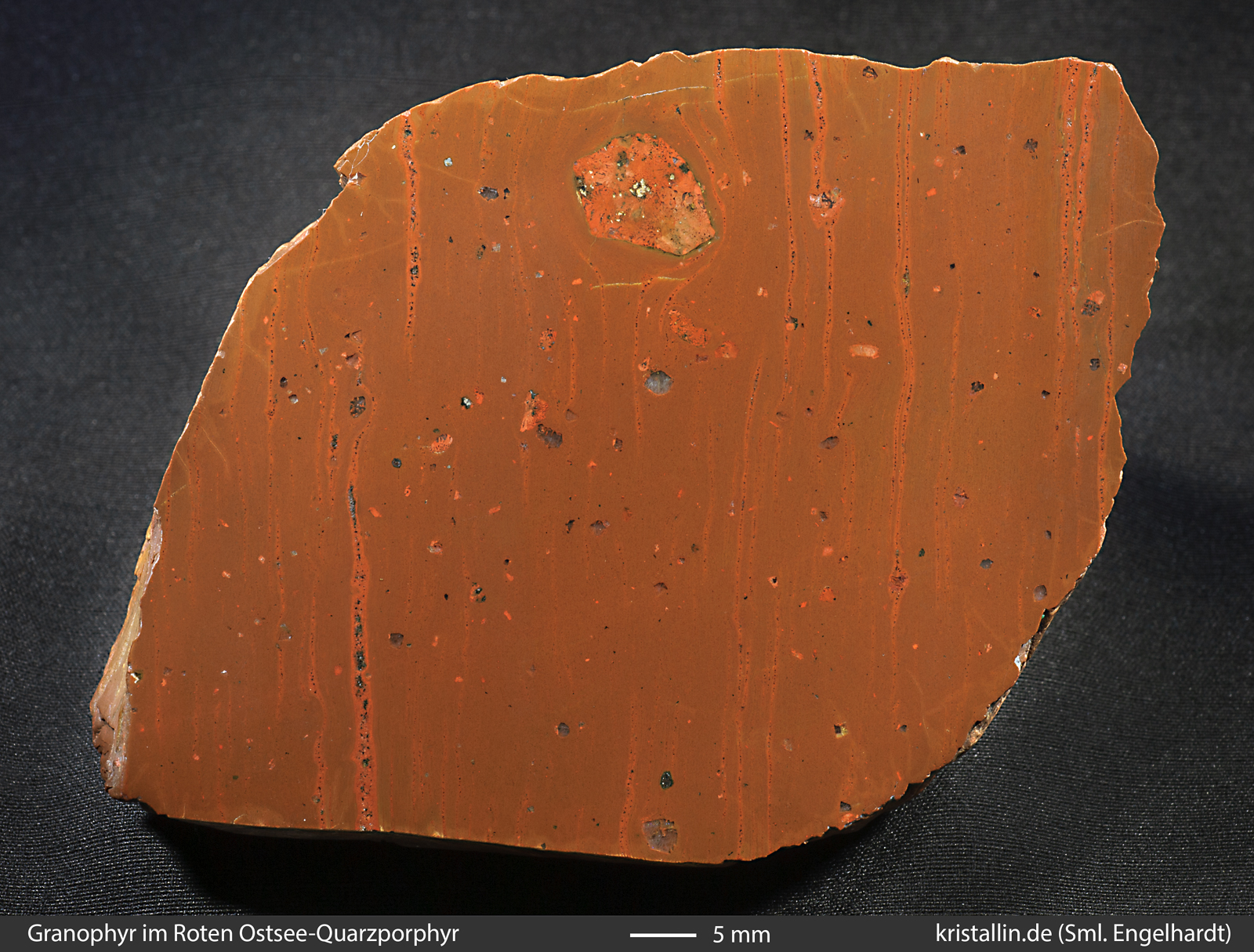 Die dunklen und feinkörnigen Einschlüsse sind meist recht klein, können aber auch mehrere Zentimeter Größe erreichen (Bild 5). Rote Ostsee-Quarzporphyre mit so vielen Xenolithen wie im Bild 5 sind aber die Ausnahme.