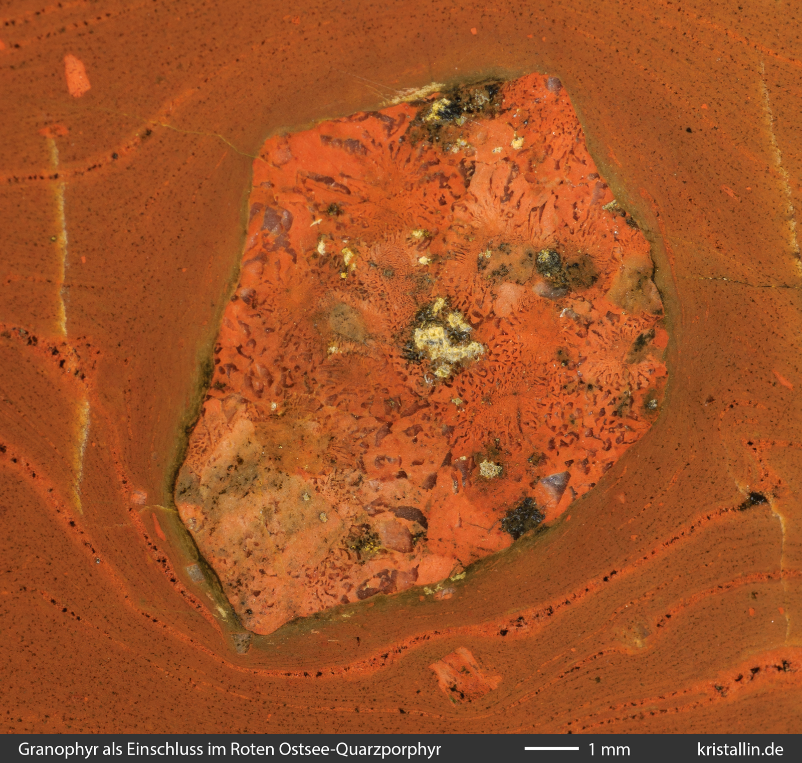 Die kleinen Strukturen im Granophyr-Einschluss sind die winzig kleinen Quarze der graphischen Verwachsungen. Das rote Mineral ist wieder Alkalifeldspat.