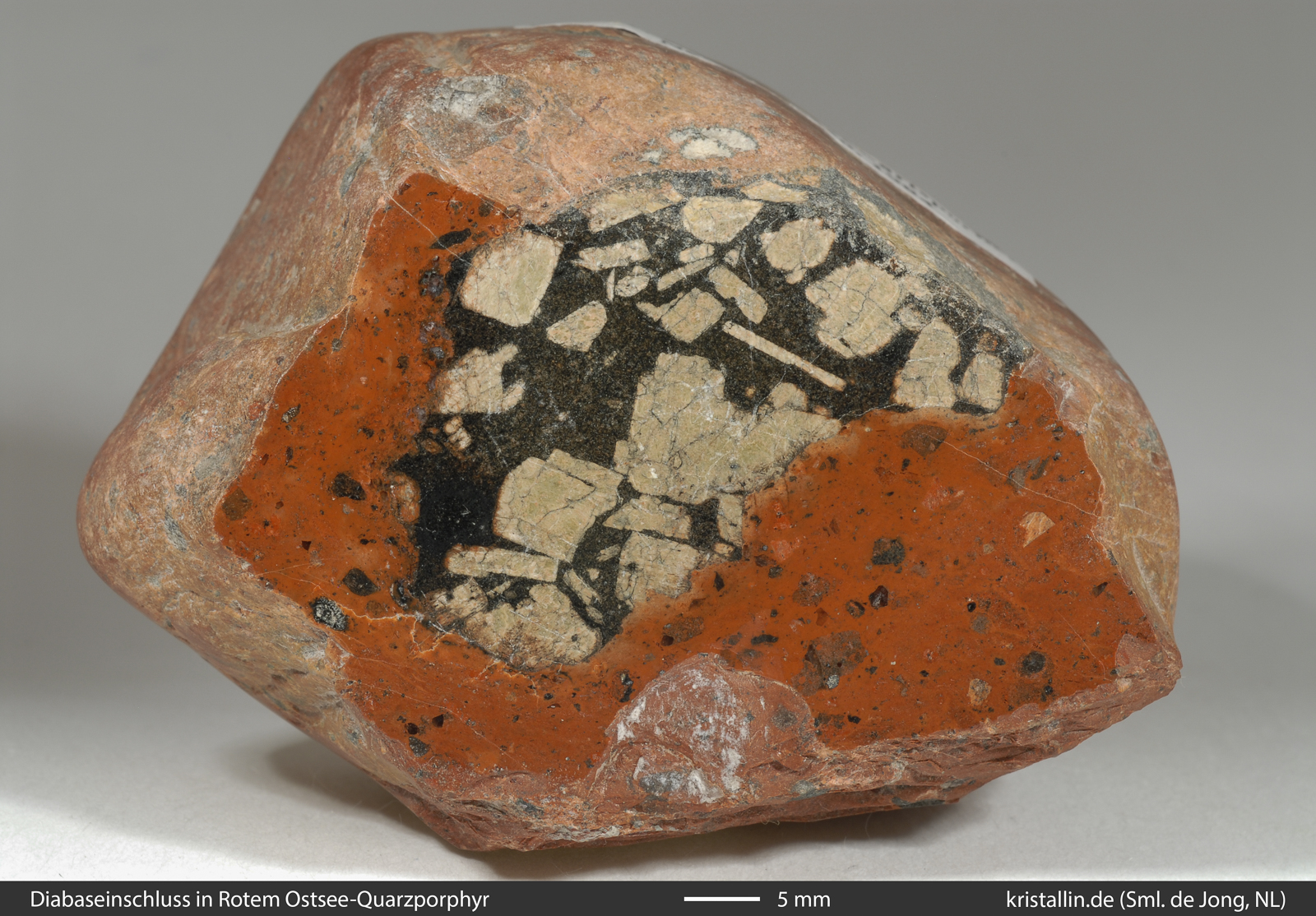 Der nächste Einschluss ist nicht minder spektakulär. Hier steckt ein grobkörniger Diabas (Dolerit) in einem Roten Ostsee-Quarzporphyr. Das Stück wurde von Jelle de Jong aus den Niederlanden gefunden.