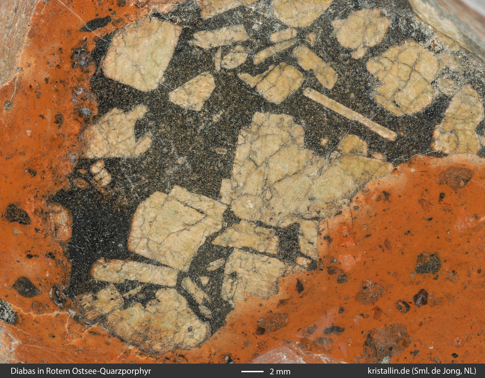 Schaut man genau hin, sieht man, dass die Porphyrschmelze viel heißer war als üblich. Hier löst das rötliche Magma den dunklen Gast auf, denn an dessen linker Flanke dringt bereits die Schmelze ein. Die Außenkante des Dolerits ist aufgelöst und seine hellen Plagioklaskristalle haben, obwohl innen liegend, an ihren linken Kanten einen rötlichen Überzug. Der rührt von eingedrungener Schmelze her.