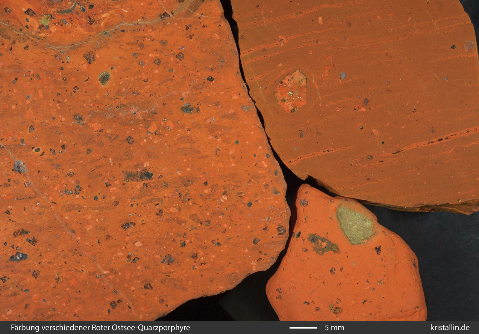 Rote Vulkanite mit rundlichen Quarzen sind keine Roten Ostsee-Quarzporphyre, auch wenn die Quarze Korrosionsspuren zeigen. Ebenso sind rundliche Alkalifeldspäte ein Hinweis auf ein anderes Herkunftsgebiet.
