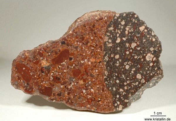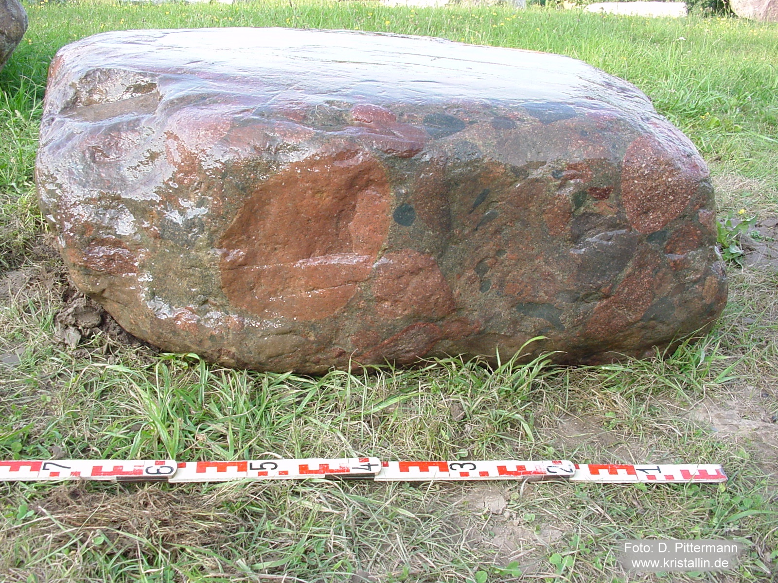 Bildung: Konglomerate sind Sedimentgesteine aus gerundeten und miteinander verkitteten Gesteinsbruchstücken. Diese Bruchstücke müssen in einem Konglomerat größer als 2 mm sein. Sind sie kleiner, handelt es sich um einen Sandstein. Die Gesteinsbruchstücke („Klasten“) bilden sich durch Verwitterung. Anschließender Transport in Bergbächen, Flüssen oder durch die Brandung an Küsten rundet sie zusätzlich. Sammeln sich solche Gerölle zu ganzen Lagen, bezeichnet man sie als Kies. Werden solche Kieslagen von Sand, Ton oder ähnlichen feinkörnigen Sedimenten zugeschüttet, bildet sich die Matrix, also das Füllmaterial zwischen den einzelnen Geröllen. Eine fortdauernde Ablagerung von Sedimenten auf der Oberseite erhöhte die Auflast in den tieferen Schichten und förderte die Verdichtung. Damit sich eine solche Sedimentpackung in ein festes Gestein verwandelt, bedarf es jedoch zusätzlich eines "Klebstoffs". Meist handelt es sich dabei um Quarz (SiO2) oder Kalzit (CaCO3). Diese gelangen, in zirkulierendem Wasser gelöst, ins Sediment. Die Löslichkeit von Kalzit ist jedem bekannt und seine Eignung als Bindemittel offensichtlich. Aber Quarz in Wasser gelöst? Auch wenn Quarz unter Alltagsbedingungen praktisch nicht wasserlöslich ist, ändert sich das grundlegend in alkalischen Wässern und bei hohen Temperaturen. Kommt solch mineralbefrachtetes Wasser in eine Region mit einem anderen pH-Wert oder veränderter Temperatur, werden Kalzit oder Quarz wieder ausgeschieden und verbinden das Umgebungssediment. Zum chemischen Gefälle und Temperaturschwankungen kommen die langen Zeiträume. Auch winzigste, im Wasser gelöste Mengen addieren sich in Jahrhunderten, wenn sie ständig ausgefällt werden. Herkunft: Konglomerate sind im Geschiebe gar nicht selten, aber ihre Herkunft läßt sich keineswegs immer bestimmen. Das Digerberg-Konglomerat jedoch, um das es hier geht, stammt aus Dalarna in Mittelschweden und ist ein vorzügliches Leitgeschiebe. Es ist unverwechselbar und besteht in seiner auffälligsten Form aus Geröllen von Dalarna-Porphyren. Damit gehört es zu den hübschesten und buntesten Gesteinen, die man finden kann. Es kann auch von dem erkannt werden, der es vorher noch nie gesehen hat. ![]() ![]() Dieses Digerberg-Konglomerat hat einen Durchmesser von 80 cm. Das Foto entstand in Dalarna, dicht beim Bärenpark am Berg "Grönklitten", nördlich vom Siljansee. Die Nahaufnahme zeigt das charakteristische der Digerberg-Konglomerate: Gerölle von unterschiedlichen Dalarna-Porphyren, die in eine Matrix aus feinkörnigem Sediment eingebettet sind. Im Bild unten sind zwei Gerölle rechts und links angeschnitten, unten ist der Rand eines dritten, hellbraunen zu sehen. In der Matrix stecken weitere kleine Gerölle. ![]() ![]() Solche Stücke findet man nicht nur in Schweden, wie das folgende Bild zeigt. ![]() ![]() Dieses ausnehmend schöne Digerberg-Konglomerat wurde von Dirk Pittermann bei Tarzow im nördlichen Mecklenburg gefunden. Es hat eine Länge von knapp einem Meter und befindet sich jetzt im Geschiebegarten in Raben Steinfeld, am östlichen Stadtrand von Schwerin. Sie können es dort besichtigen. (Anfahrtsskizze) Unterhalb noch einige Bilder, zuerst die Fundsituation. (Alle Bilder dieses Geschiebes: Dirk Pittermann, Zittow)