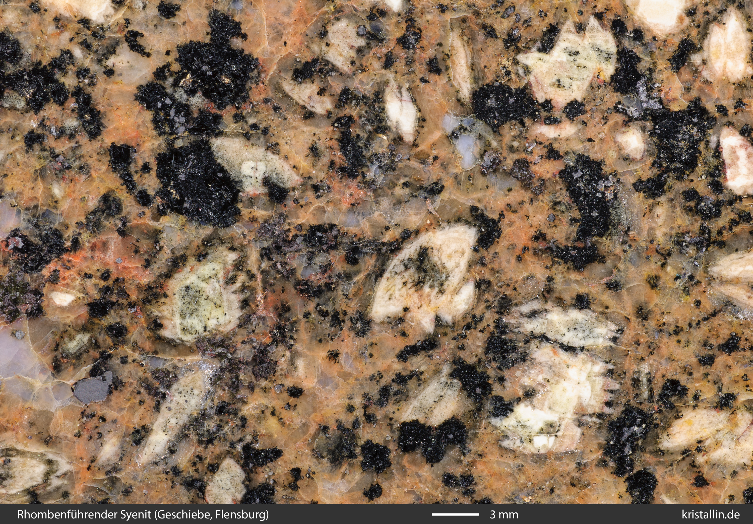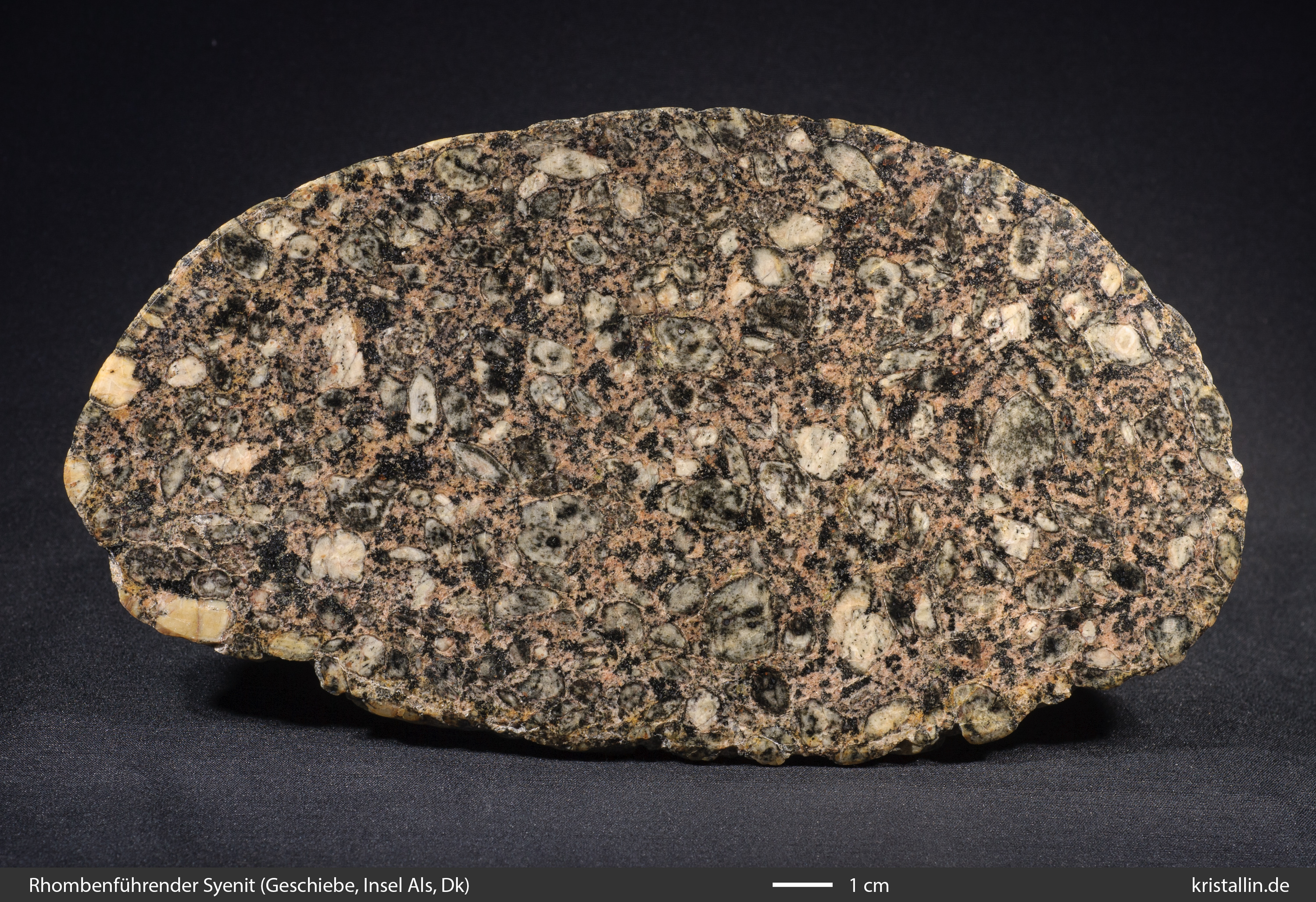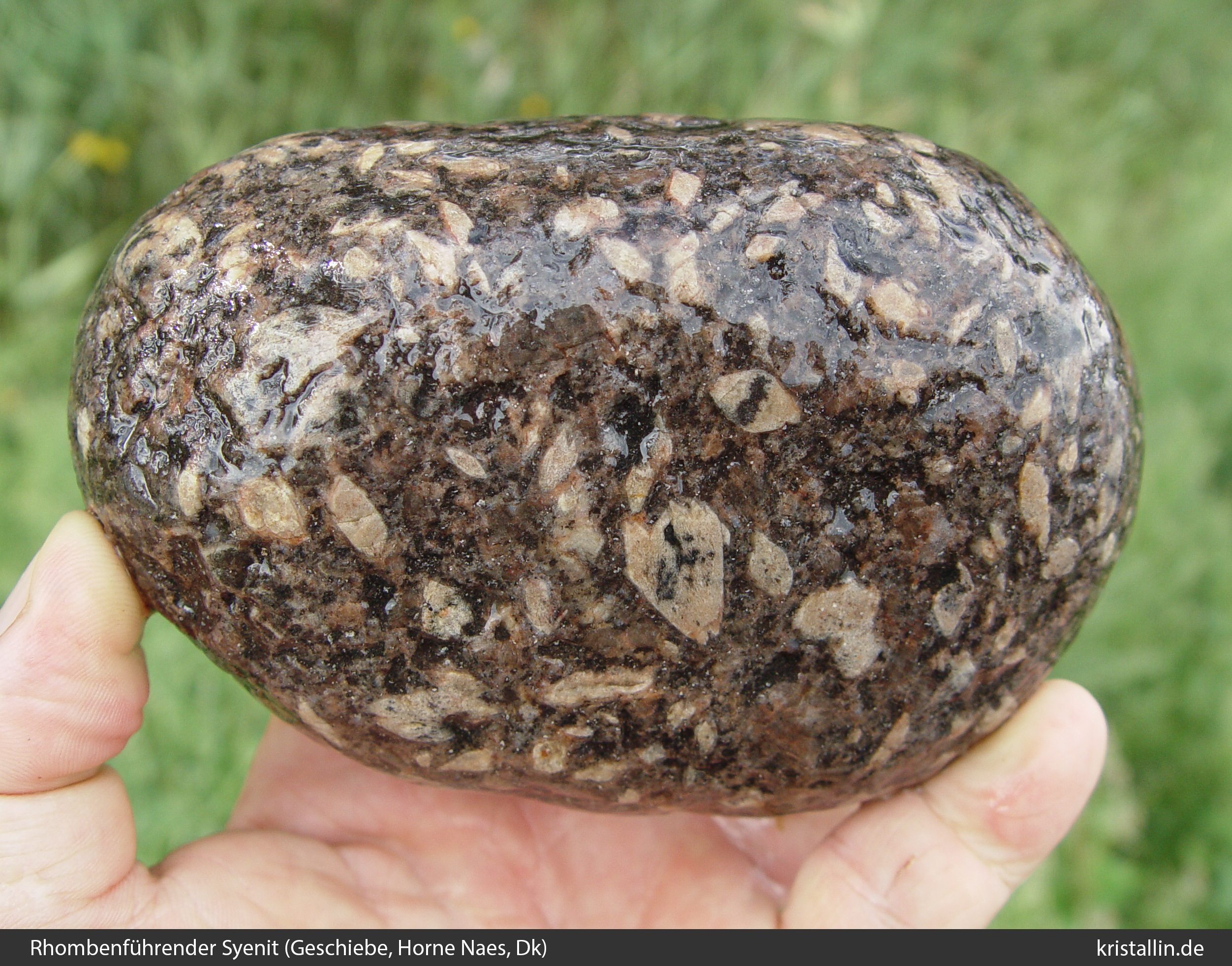 Wer sich mit Gesteinen in Norddeutschland beschäftigt, wird über kurz oder lang einen dieser rhombenführenden Syenite finden. Die Geschiebe sind an den Rhomben und der körnigen Grundmasse leicht zu erkennen. Oft stecken darin auch kleine Granate. Quarz fehlt oder macht nur einen kleinen Teil des Gesteins aus.