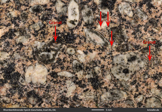 - Die Grundmasse ist graubraun, braun oder selten auch rötlichbraun und immer körnig. Darin unterscheiden sich diese Gesteine von Rhombenporphyren. Mit dieser Grundmasse ist das Gestein ein Tiefengestein und ganz sicher kein schnell erstarrter Vulkanit.