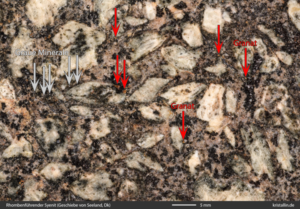 Hier ist die rötlich-braune Farbe auffällig, denn die meisten rhombenführenden Syenite sind eher grau und dunkler. Granat kommt hier nur spärlich vor, dafür ist etwas mehr Quarz enthalten, der als hellgraues Mineral leicht zu erkennen ist. Der Quarzgehalt ist aber so niedrig, dass auch dieses Stück ein Syenit ist.