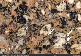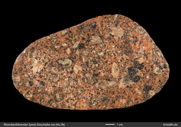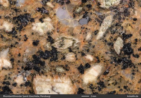 Diese Syenite kommen in verschiedenen Varianten vor und ähneln ein wenig den norwegischen Rhombenporphyren. Aber diese Geschiebe stammen nicht aus Norwegen und es handelt sich auch nicht um Rhombenporphyre aus Gängen. Die Herkunft dieser Gesteine ist unbekannt. Südschweden erscheint als Herkunftsregion wahrscheinlich.