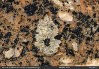 - Ein Teil der Rhomben enthält dunkle Minerale, die makroskopisch nicht bestimmbar sind und die Rhomben fleckig aussehen lassen. Einzelne Rhomben sind feinkörnig und grünlichgrau.