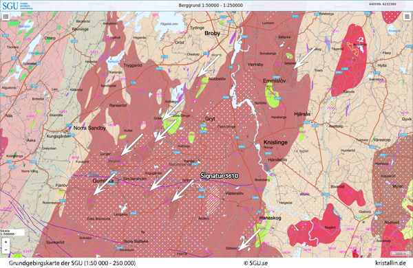 Die Grundgebirgskarte der SGU (1:50000 - 1: 200000) ist online zugänglich. Darin tragen die Syenite die Nummer 3610 und sind nur geringfügig dunkler gefärbt als die anderen braunen Signaturen.