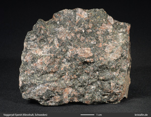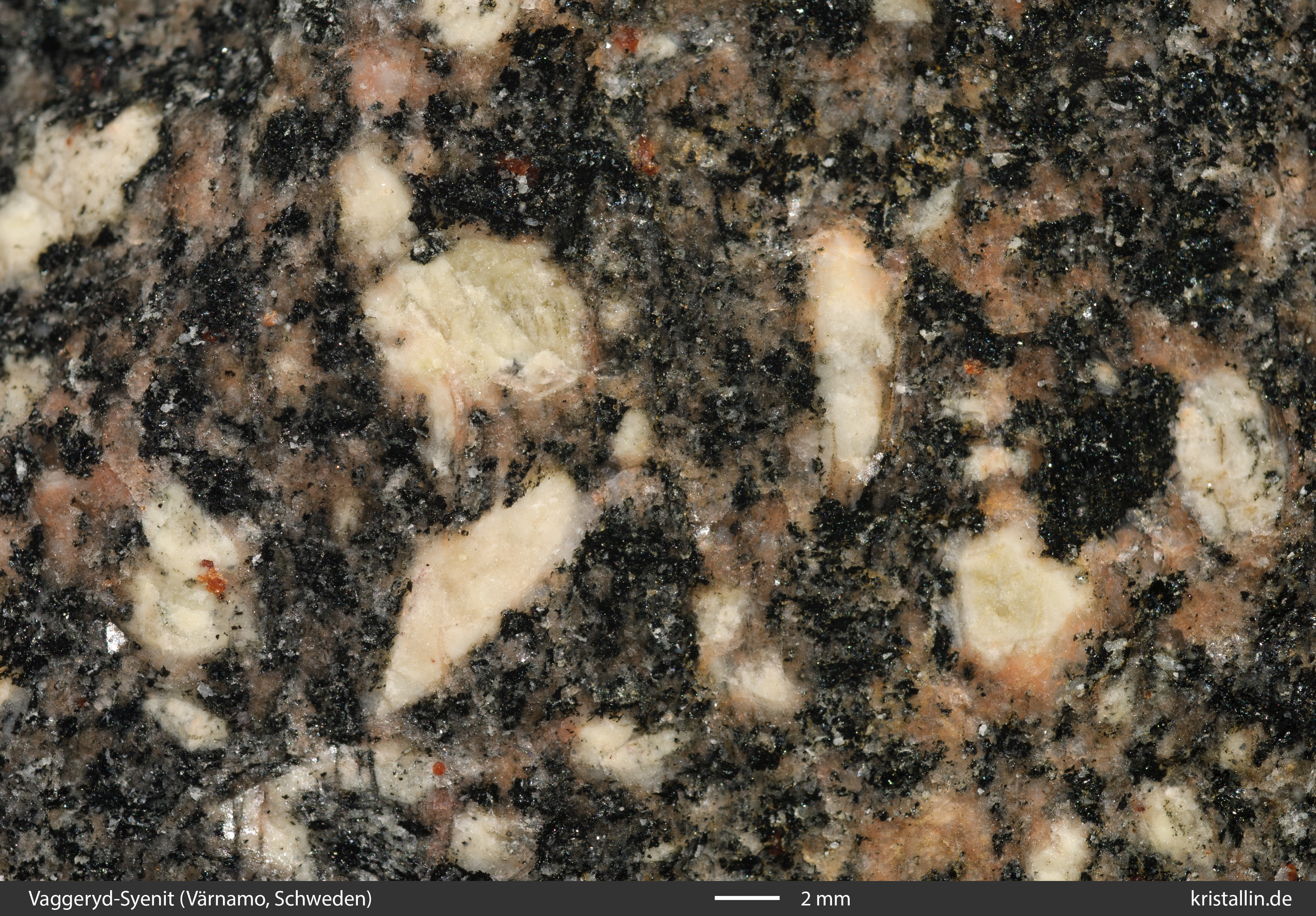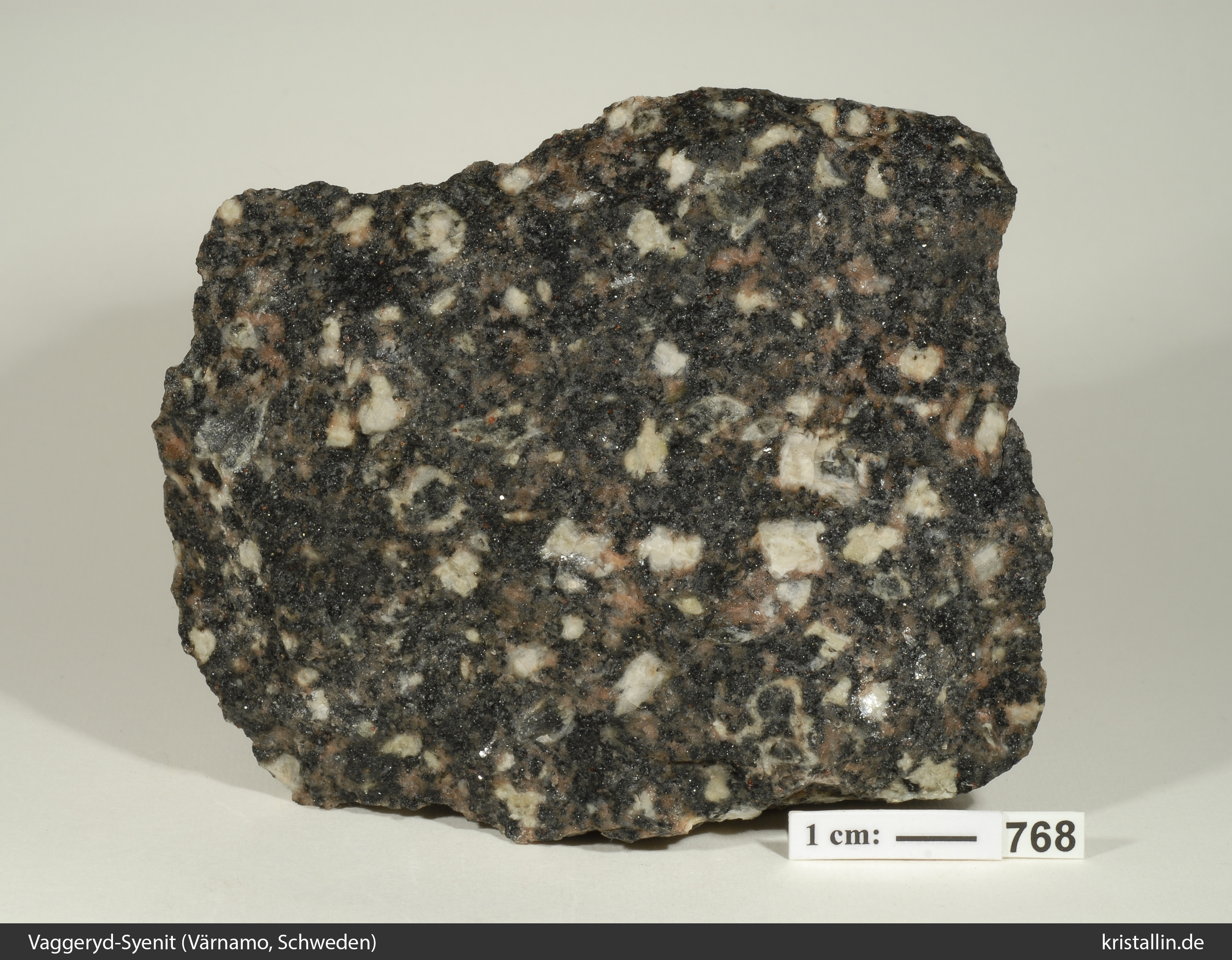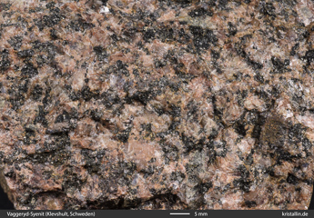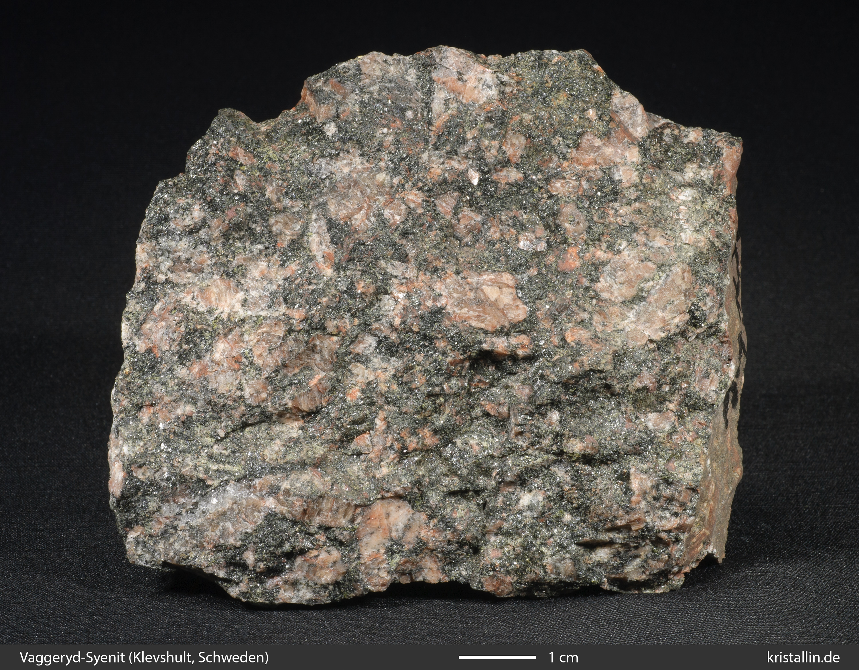Aus dem weiter südlich gelegenen Steinbruch bei Värnamo kommen die folgenden beiden Proben. Dieser Vaggeryd-Syenit ist porphyrisch und enthält auch Granat.