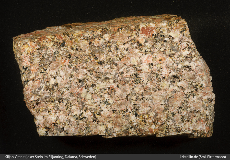 (3/37) Blasser, leicht rötlicher Siljan-Granit mit ausgeprägter Ungleichkörnigkeit des Mineralbestands. Sechseckige Formen des Biotits sind hier nicht zu erkennen, aber als dunkles Mineral kommen zusätzlich schwarze, längliche und stängelige Aggregate von Hornblende/Amphibol vor, die nach bisherigen Beobachtungen in den bunten Småland-Graniten fehlen. Die Probe ist ein loser Stein aus dem Siljan-Ring; Lokalität 9.