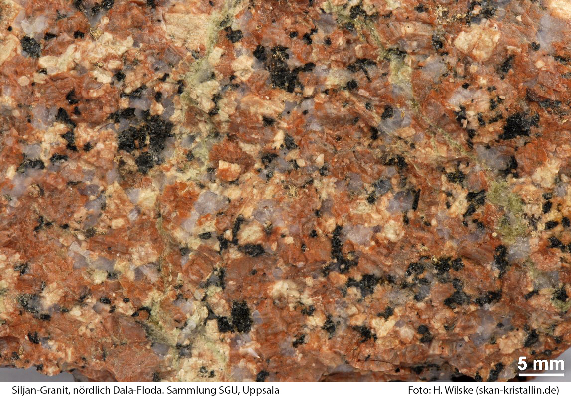 (8/37) Die dritte und letzte Probe kommt den Beschreibungen des Leitgeschiebes näher. Es ist ein gleichkörniger Granit mit klaren Korngrenzen und weitgehend gleichmäßiger Verteilung der Minerale. Der gelbe Plagioklas ist etwas kleiner als der rote Feldspat. Ungewöhnlich ist die bläulich-trübe Tönung des Quarzes, die laut Beschreibung nur gelegentlich auftreten soll. Quarz besitzt weder eine besondere Tendenz zur Eigengestaltlichkeit, noch bildet er größere Anhäufungen wie in den Småland-Graniten. Die Probe stammt aus dem Gebiet nördlich von Dala-Floda; P. Kresten leg.; Sgl. SGU Uppsala 1987, © Sveriges geologiska undersökning; Foto: H. Wilske (skan-kristallin.de).