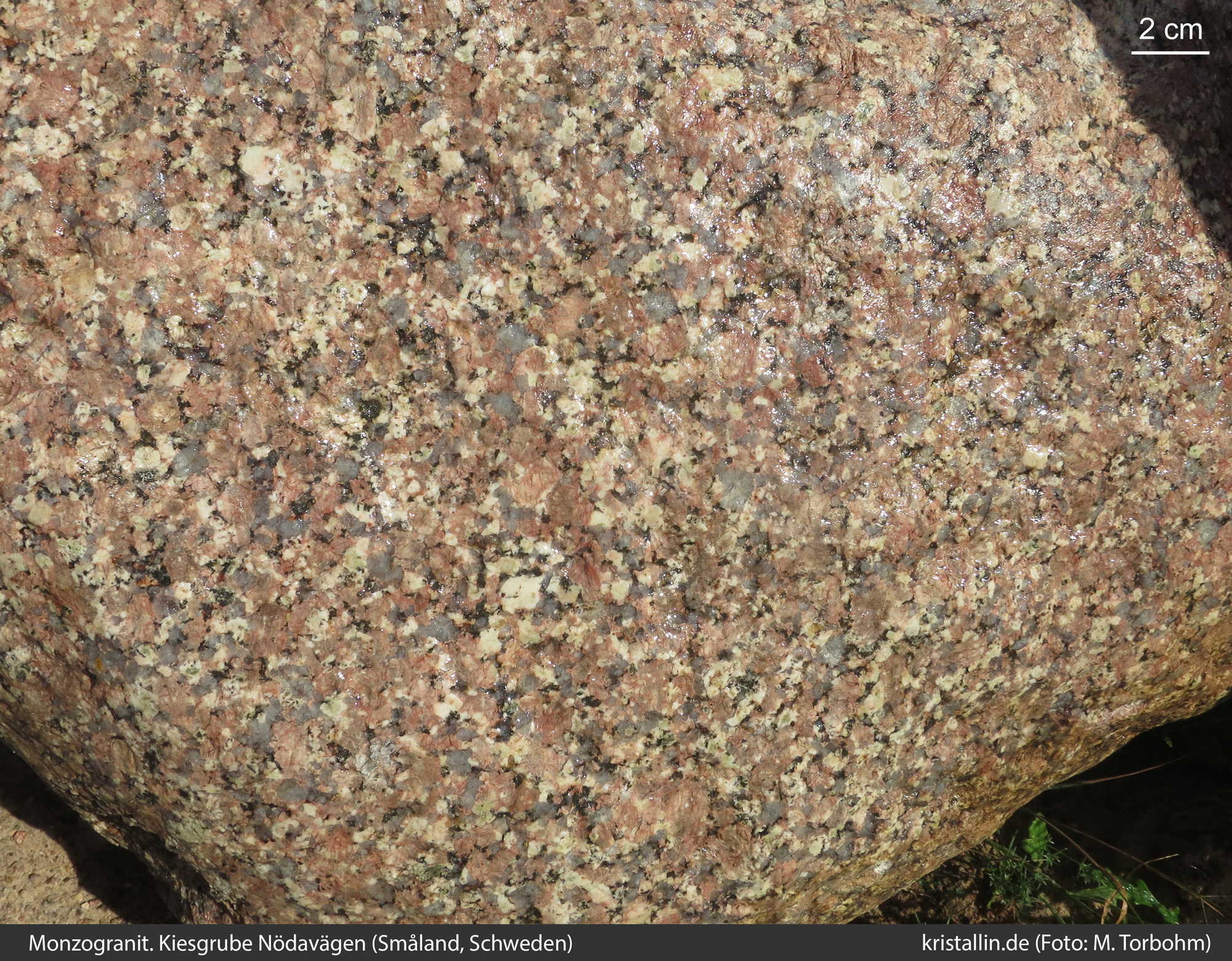 (9/37) Das erste Beispiel aus dem nördlichen Småland zeigt einen Monzogranit vom Växjö-Typ, auch wenn er durch den blassroten Alkalifeldspat nicht besonders „bunt“ erscheint. Eine Verwechslung mit dem Siljan-Granit ist bei diesem Typ kaum zu befürchten, aber er ist ein typischer Vertreter der farb- und formenreichen Småland-Monzogranite. Leichte Deformationserscheinungen deuten sich durch eine unregelmäßige Verteilung von dunklen Mineralen in Haufen oder Bändern an. Nahgeschiebe, Lokalität 6, Probenverzeichnis am Ende des Artikels.