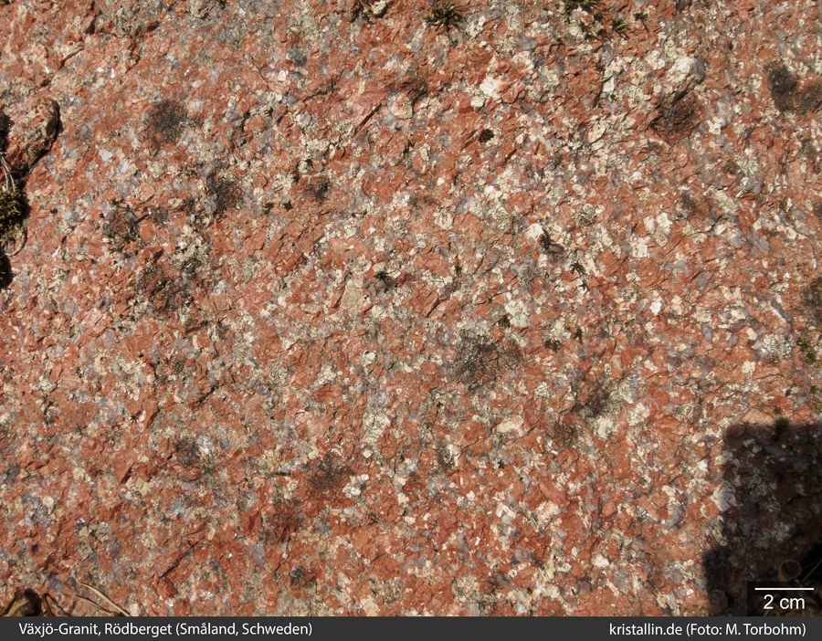 (13/37) Ein ähnlicher Granittyp fand sich anstehend in einem alten Steinbruch mit der passenden Bezeichnung „Rödberget“ („Der rote Berg“) an der Lokalität 3. Die angewitterte Oberfläche zeigt intensiv roten Alkalifeldspat, gelben Plagioklas und hellgrauen, etwas getrübten Quarz.