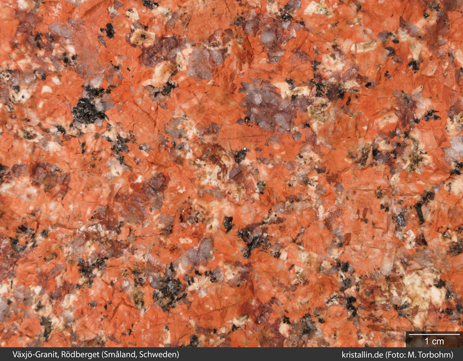 (14/37) Detailbild einer frischen Bruchfläche, Aufnahme unter Wasser: Der hellgraue bis schwach bläuliche und trübe Quarz bildet unklar konturierte, rissige Aggregate, ein deutlicher Hinweis auf Deformationserscheinungen. Auch der gelbe Plagioklas besitzt teilweise undeutlich Korngrenzen und ist an manchen Stellen von rotem Pigment durchsetzt. Roter Plagioklas ist von einigen Östergötland-Graniten aus dem Gebiet zwischen Linköping und Vätternsee bekannt, vom Siljan-Granit hingegen nicht (vgl. Smed/Ehlers 2002: 148).