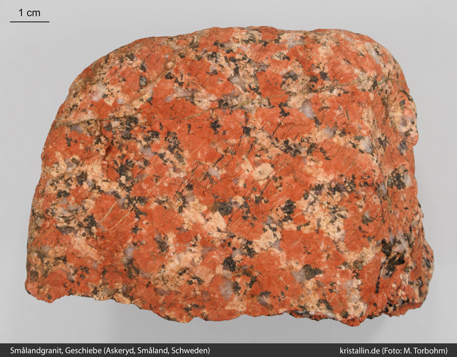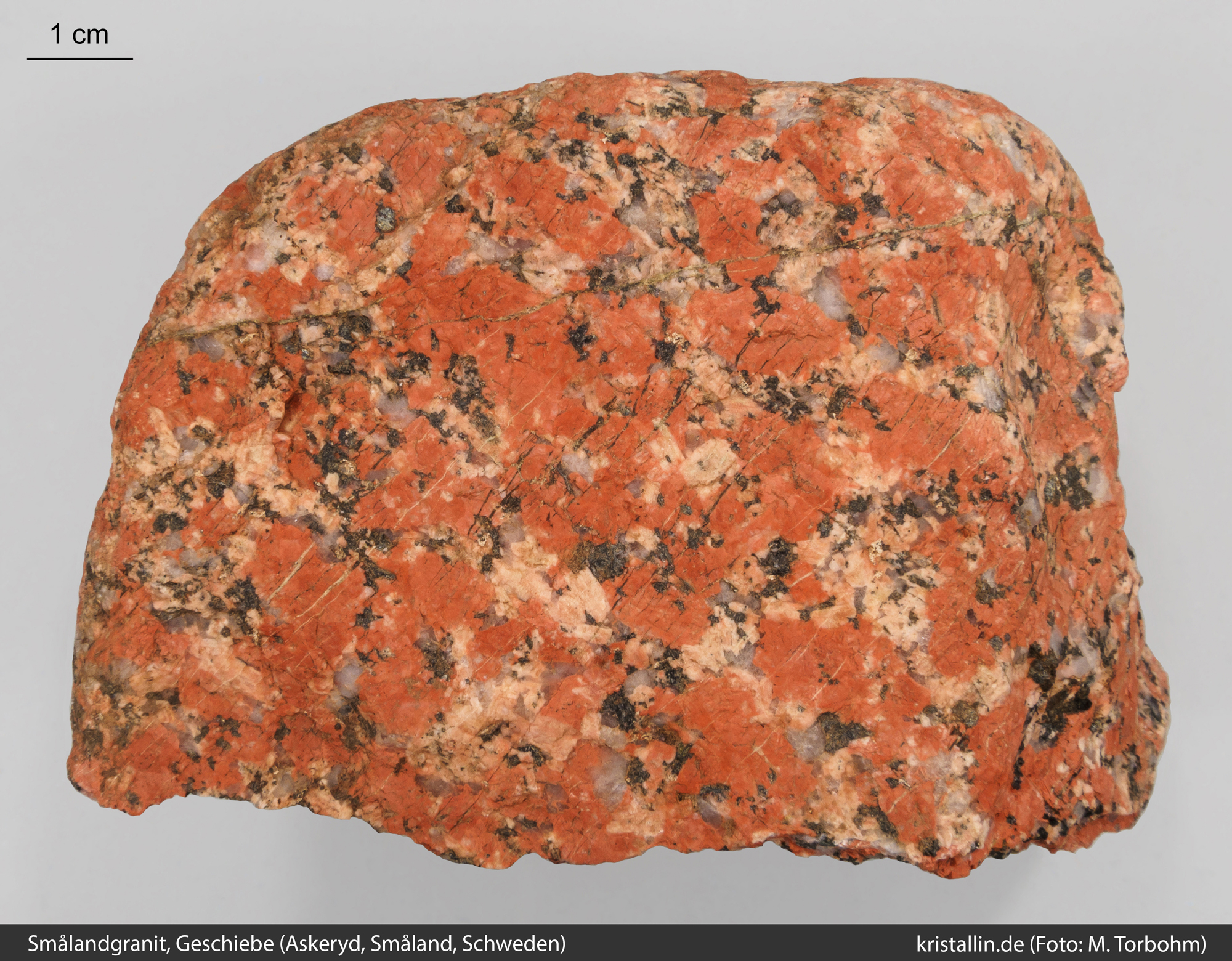 (16/37) Abschlag vom Nahgeschiebe in Abb. 15, oben links: Granit bis Quarz-Syenit mit rotem Alkalifeldspat, gelbem Plagioklas und mäßig vielen dunklen Mineralen (Biotit). Wenig schwach bläulicher Quarz bildet kleine Körner und rundliche Ansammlungen.