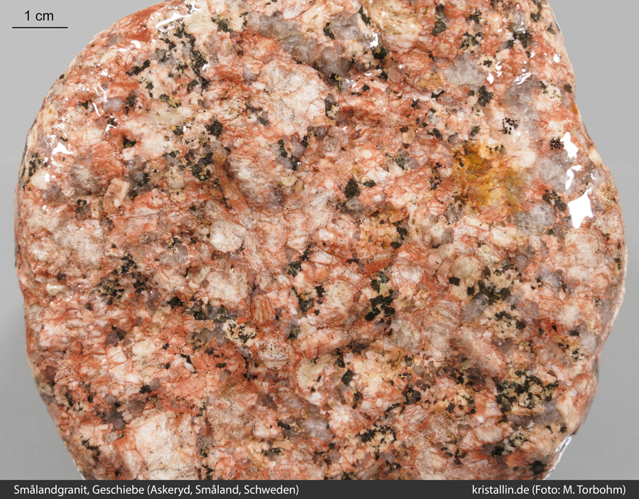 (18/37) Detail des in Abb. 15 oben rechts abgebildeten Geschiebes. Dieser Granit ist recht hell und nicht „bunt“. Er wird deswegen gezeigt, weil er sechseckige, nicht verbogene Biotitplättchen enthält, die in Småland-Graniten meist deformiert sind. Auch die Quarze bilden überwiegend Einzelkörner und weniger massige Ansammlungen.