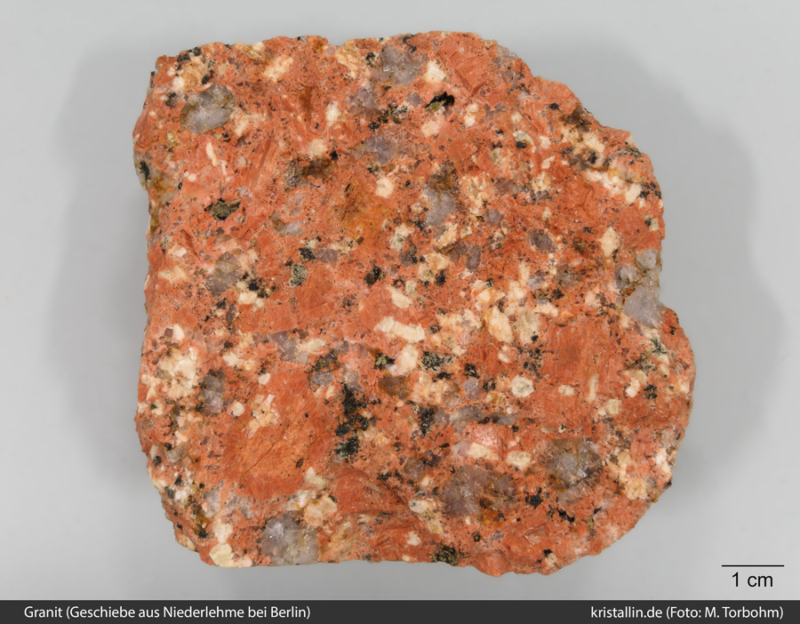 (33/37) Der letzte Geschiebefund besitzt ein porphyrisches Gefüge und den bekannten Mineralbestand aus größeren roten und kleineren gelben Feldspäten, grauem Quarz und wenig dunklen Mineralen. Es sind zusätzlich plagioklasumsäumte Alkalifeldspäte auf der Außenseite des Geschiebes vorhanden (im Bild nicht erkennbar). Kiesgrube Niederlehme bei Berlin.