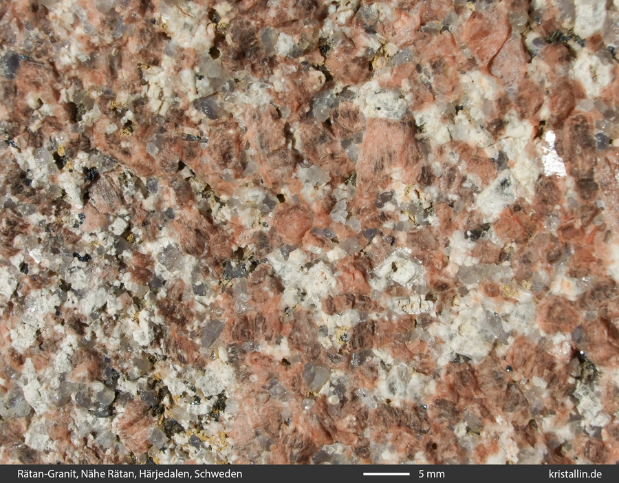 (37/37) Die letzte Anstehendprobe stammt ebenfalls aus dem Rätan-Batholith und zeigt einen kontrastreichen, mittelkörnigen und mafitarmen Granit mit rotem, durch perthitische Entmischung teilweise braun getöntem Alkalifeldspat, schneeweißen Plagioklas und individuelle, glasklare bis leicht trübe Quarzkörner von hellgrauer, teilweise bläulicher Farbe. Ähnlichkeiten dieses undeformierten Granits zum Siljan-Granit sind erkennbar, lediglich die Farben der Feldspäte weichen ab.