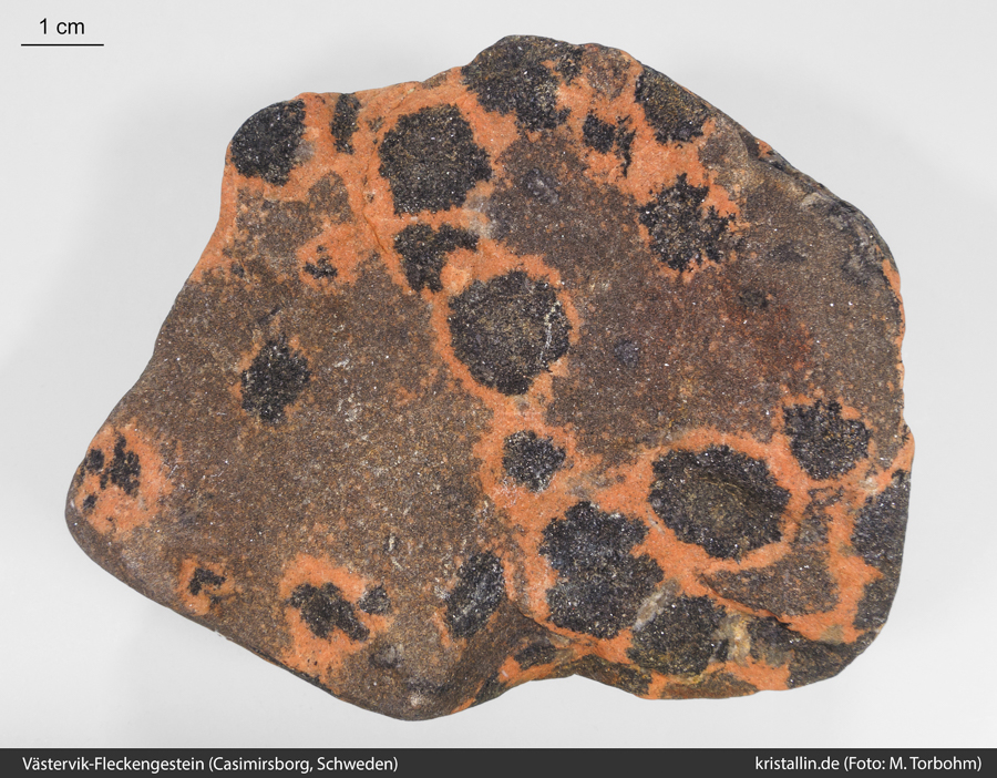 (1/55) Anstehendprobe eines Västervik-Fleckengesteins mit graubrauner und feinkörniger Grundmasse. Wenige Flecken sind von schmalen, orangeroten Säumen umgeben. Loser Stein vom Anstehenden in Casimirsborg