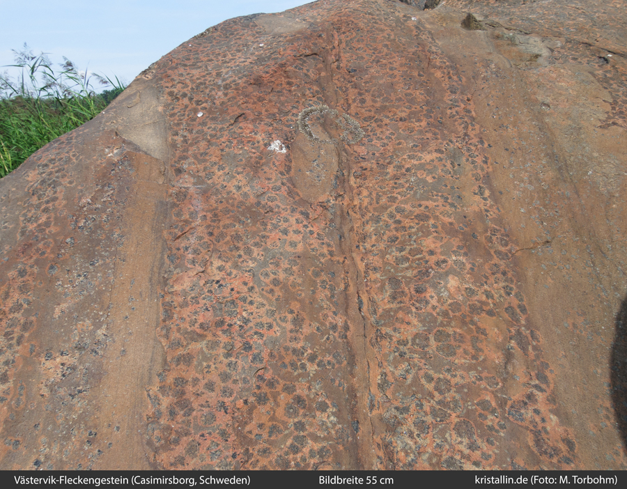 (4/55) Västervik-Fleckengestein in perfekter Ausbildung: Dunkle Flecken mit schmalen orangefarbenen Säumen sind einigermaßen dicht „gepackt“. Das Fleckengestein ist auf Lagen konzentriert, die eine sedimentäre Abfolge von sandigen und tonig-sandigen Schichten abbilden. Fleckenbildung fand nur in den tonhaltigen Schichten statt.