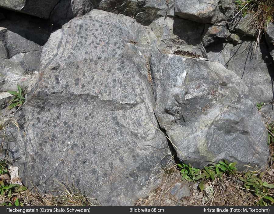 (15/55) Auch graue Fleckengesteine kommen im Västervik-Gebiet vor. Das Bild zeigt einen Aufschluss auf Östra Skälö (Lokalität 3). Ob sich diese Varianten als Leitgeschiebe eignen, ist unsicher. T. Langmann berichtet von Nahgeschieben ähnlicher Fleckengesteine (hellgraue Granofelse mit dunklen Flecken) bei Mästocka, östlich von Halmstad in SW-Schweden.